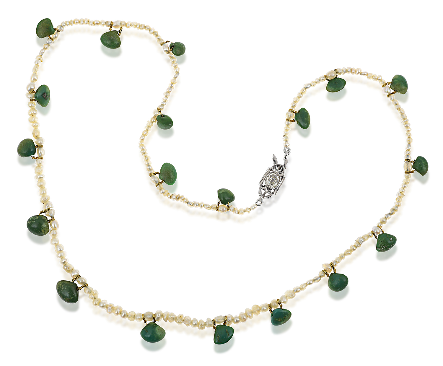 Comprising baroque natural pearls interspaced with turquoise drops, to a diamond set clasp in platinum.