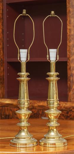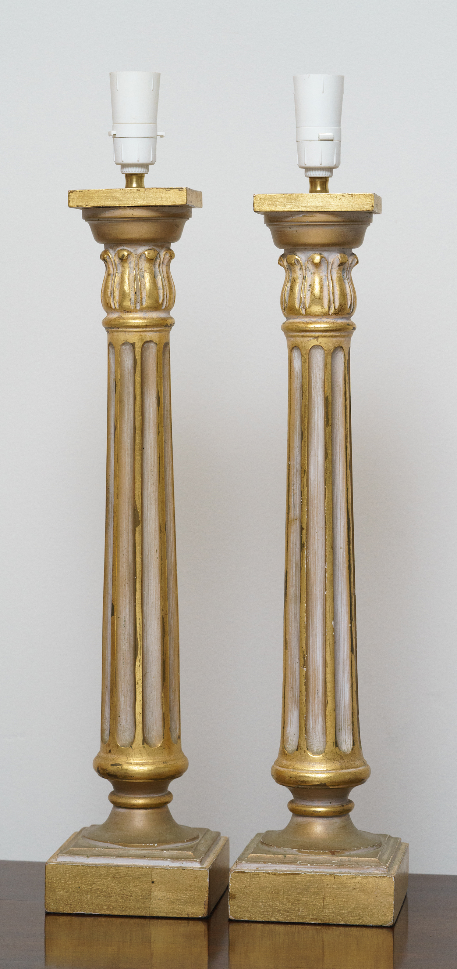 A PAIR OF FRENCH PROVINCIAL INSPIRED TABLE LAMPS AND A PAIR OF BRASS LAMPS (no shades)