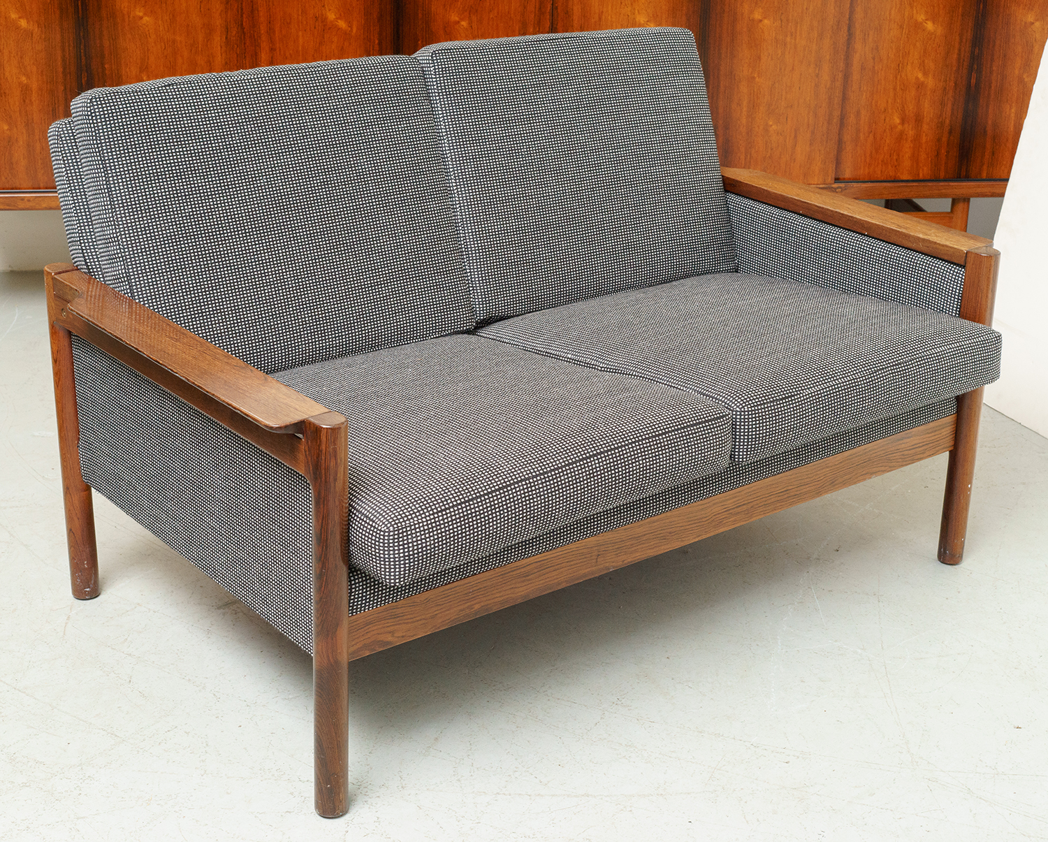 Rosewood frame, re upholstered in new Danish wool fabric