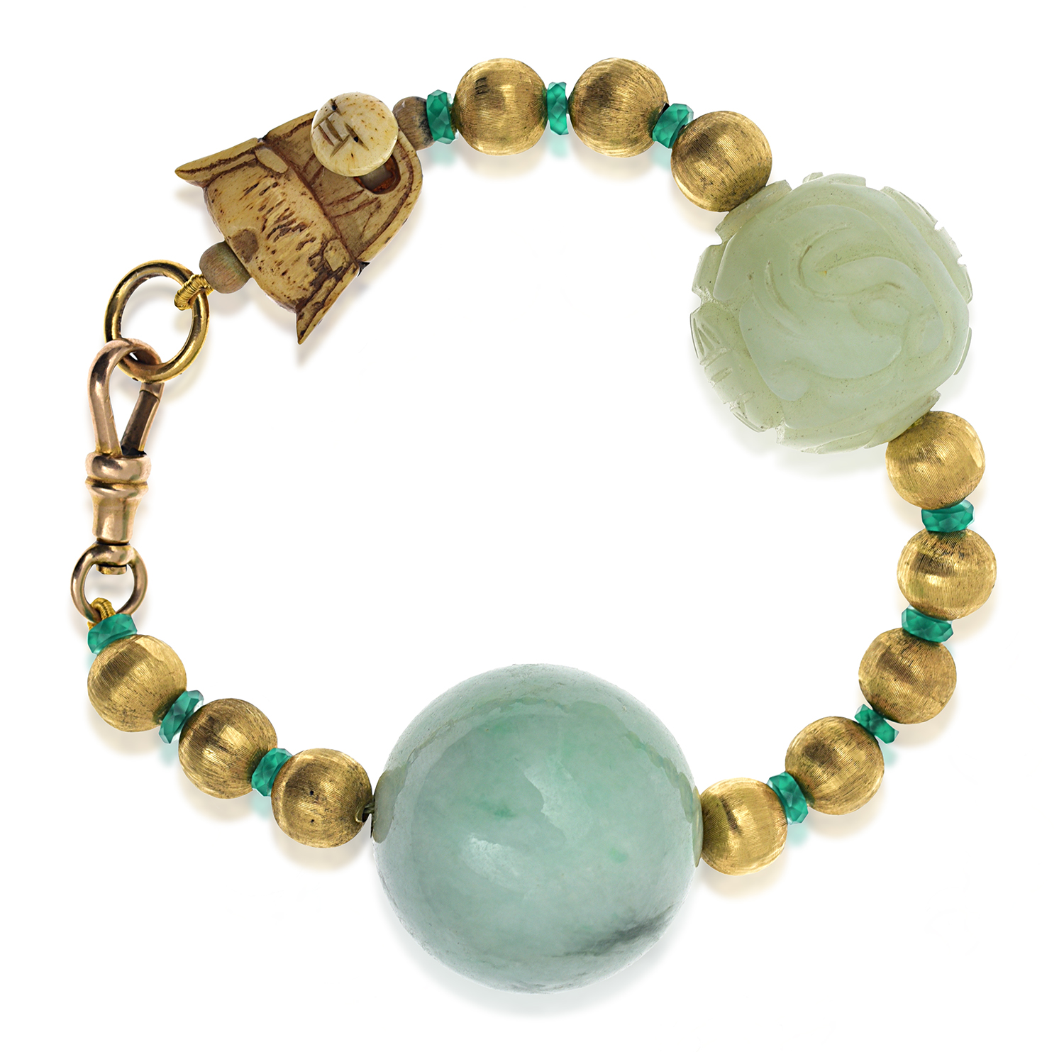 Featuring a carved netsuke, with two large jadeite beads, interspaced with gold and emeralds beads.