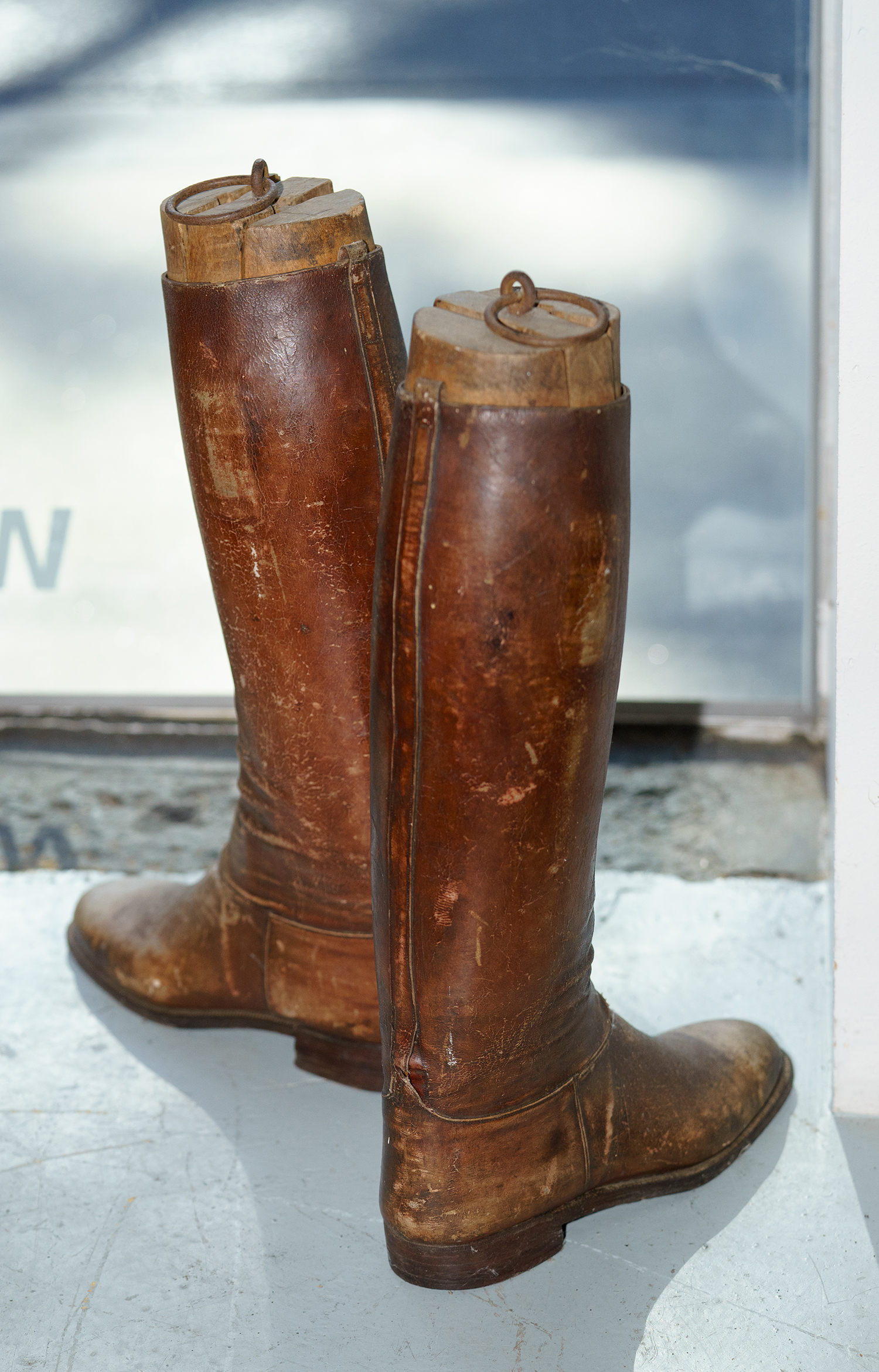 AN EARLY 20th CENTURY PAIR OF LEATHER RIDING BOOTS WITH ORIGINAL WOODEN LASTS