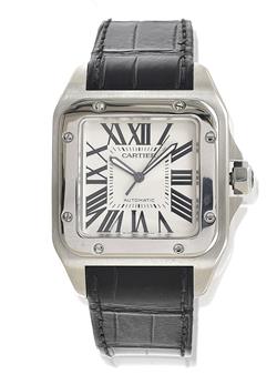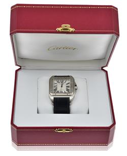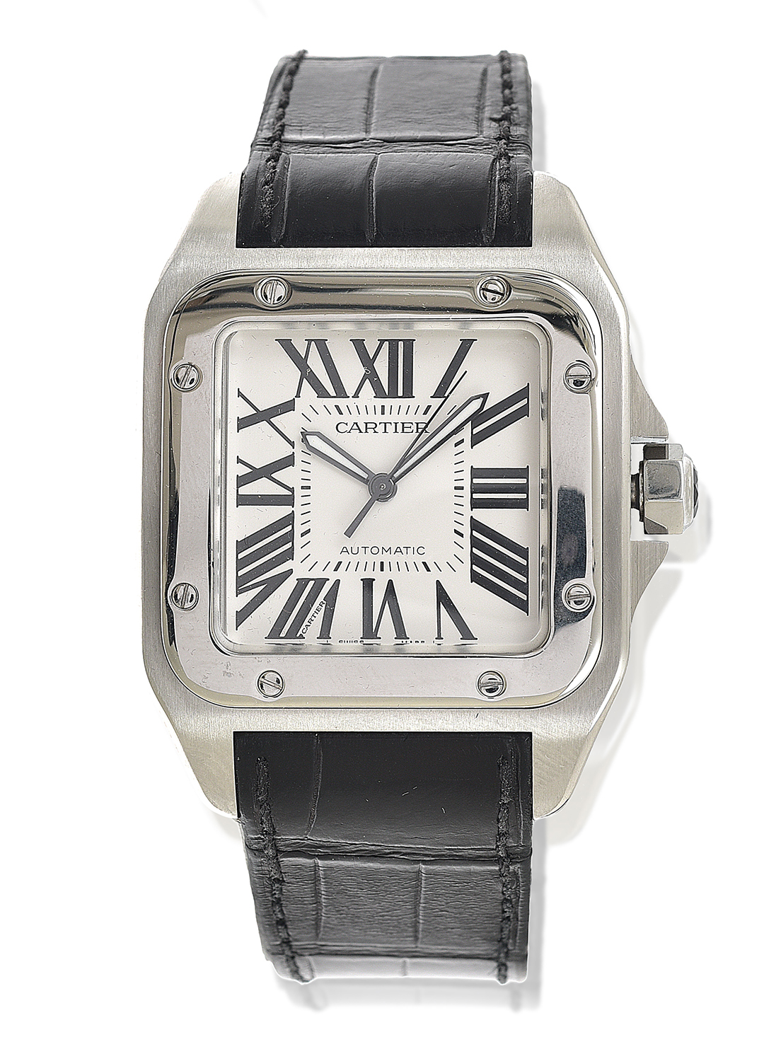 Automatic movement, square white dial with Roman numerals, signed case, dial and movement, stainless steel case and original black leather bands with signed deployment clasp, case number 293305TX, case length 35mm, with box and papers.