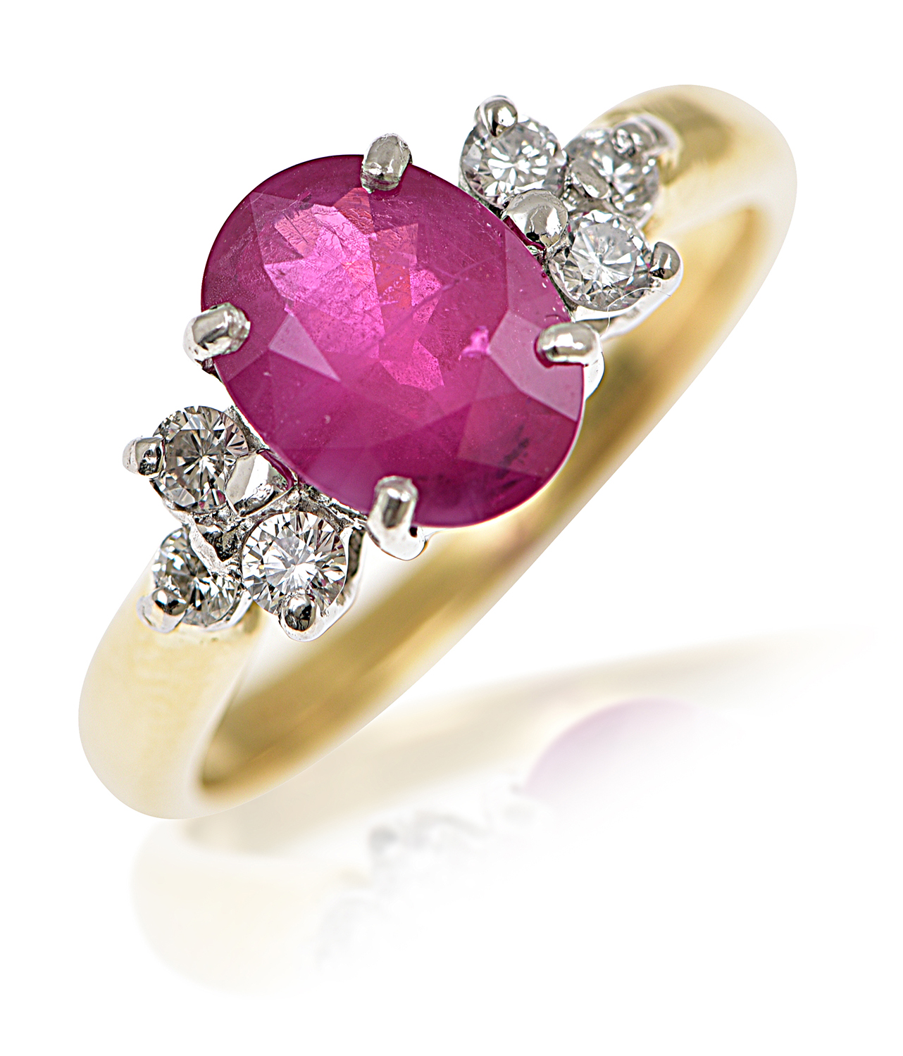 The oval cut ruby of 1.94cts having a trefoil of diamonds set to each shoulder, mounted in 18ct gold, ring size N.