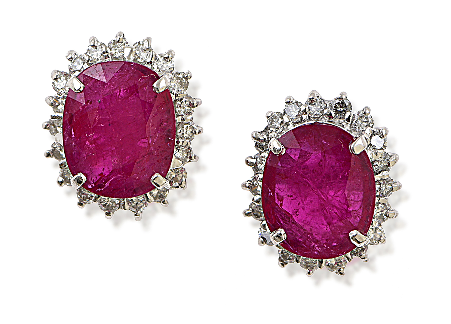 Each set with an oval cut ruby of 3.88cts or 3.40cts, surrounded by nineteen round brilliant cut diamonds totalling 0.35cts, mounted in 18ct white gold.