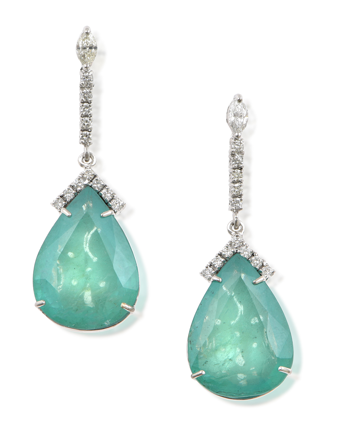 Each earring set with a pear cut emerald of 16.13cts, framed and surmounted by marquise and round brilliant cut diamonds, mounted in 18ct white gold.
