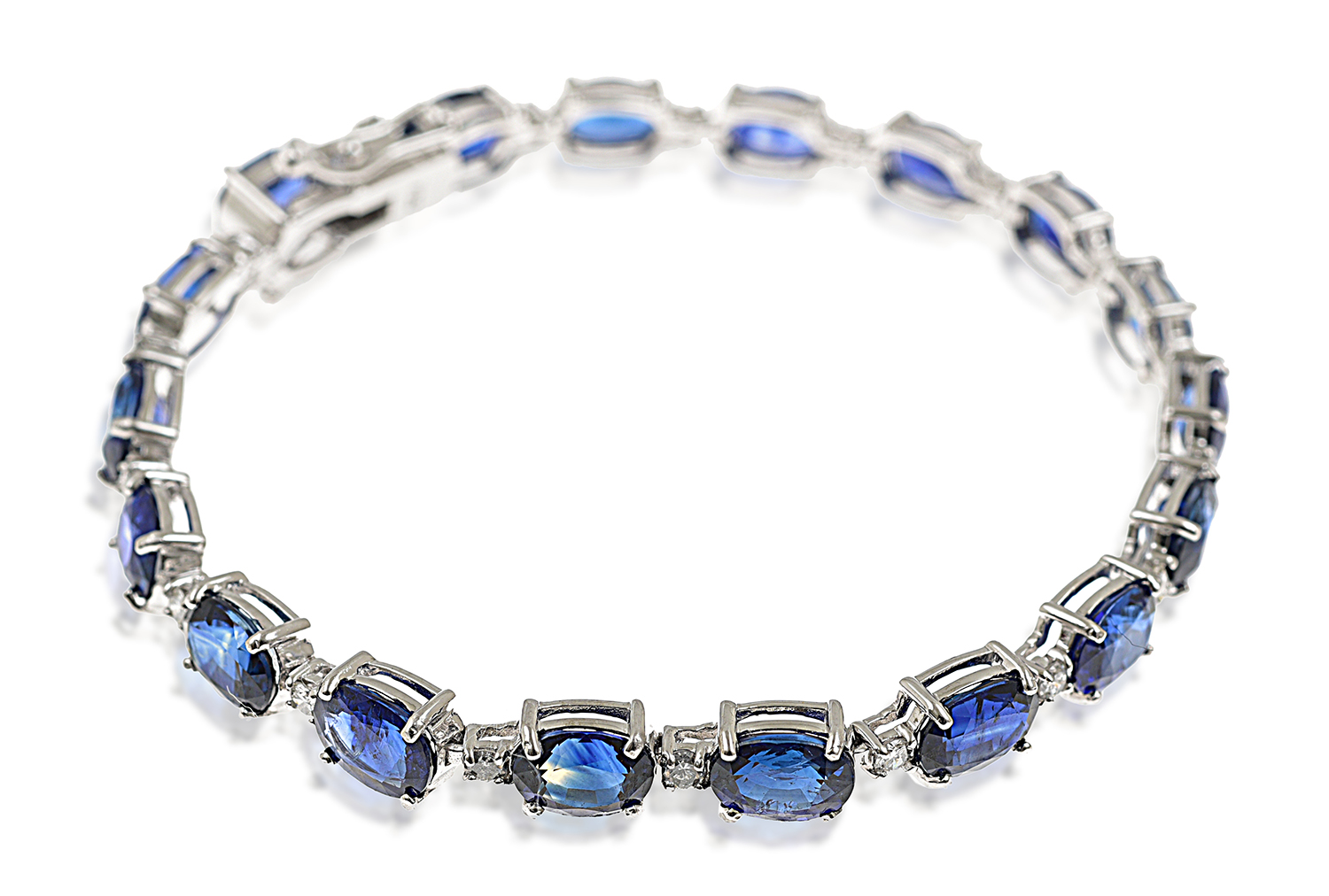 Comprising eighteen oval cut sapphires totalling 20.35cts interspaced by a round brilliant cut diamond, mounted in 18ct white gold, total length 175mm.