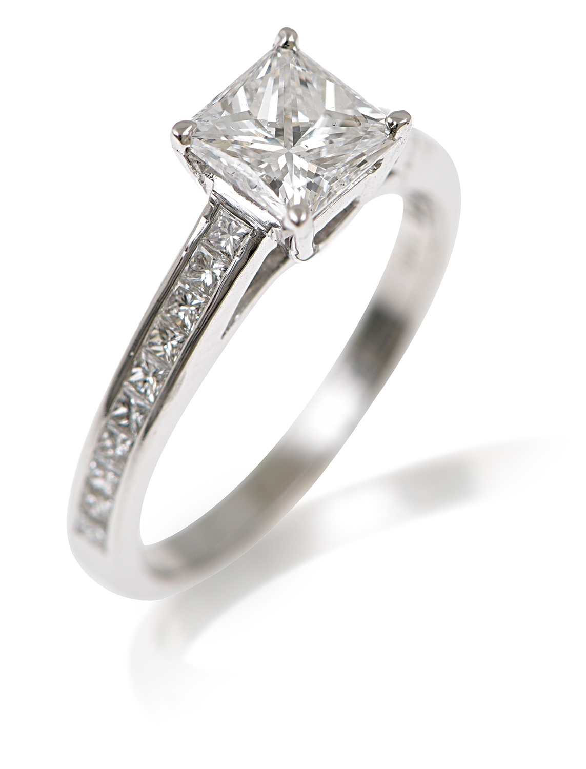 The princess cut diamond of 1.09cts having further diamond detail set to the shoulders, mounted in 18ct white gold, ring size L.
