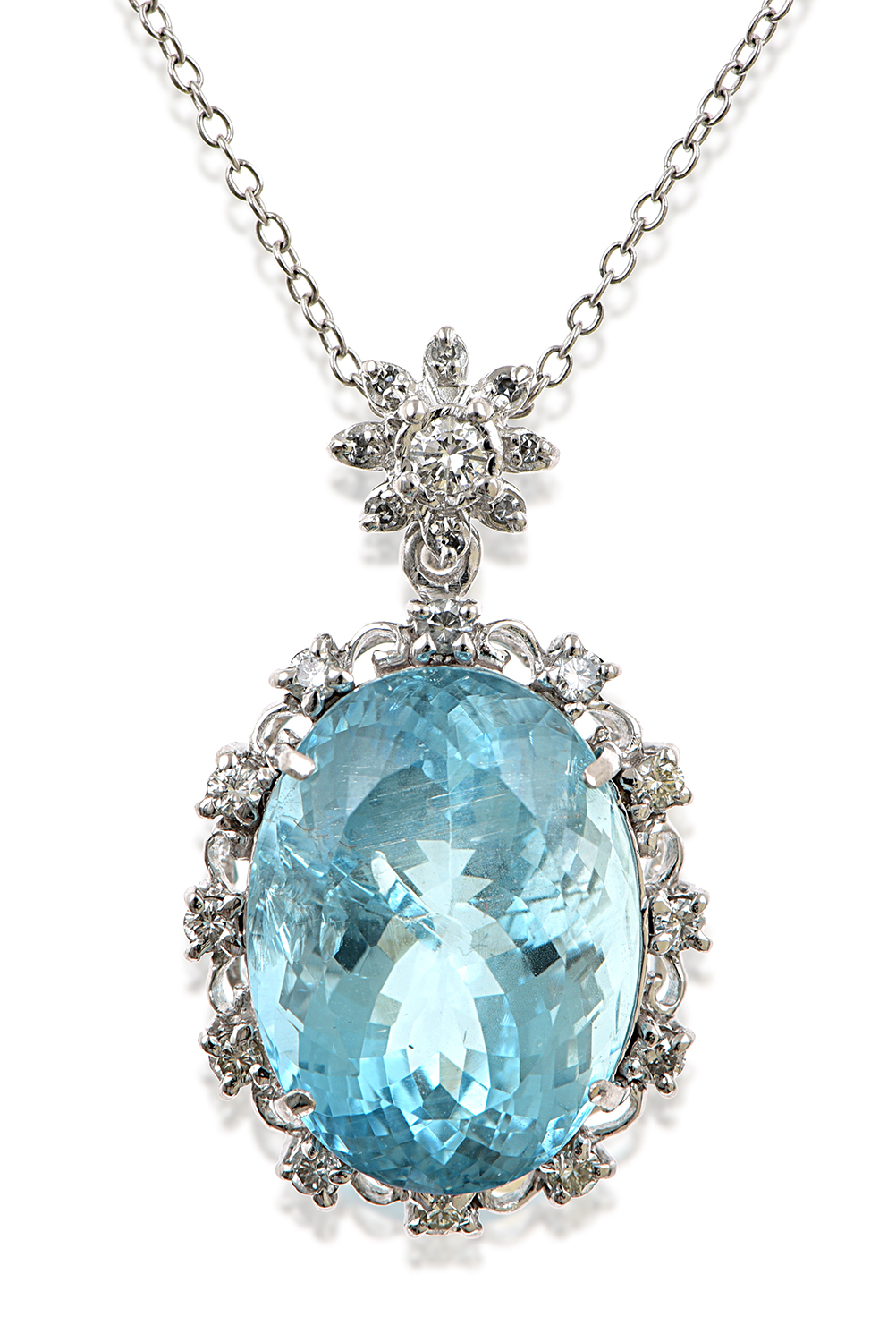 The oval cut aquamarine of 31.00cts surrounded and surmounted by round brilliant cut diamonds, to a fine trace chain, all mounted in 18ct white gold, total length 405mm.