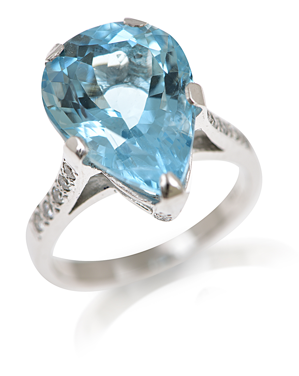The pear cut aquamarine of 8.30cts having diamond detail set to the shoulders and under bezel, mounted in 18ct white gold, ring size N.