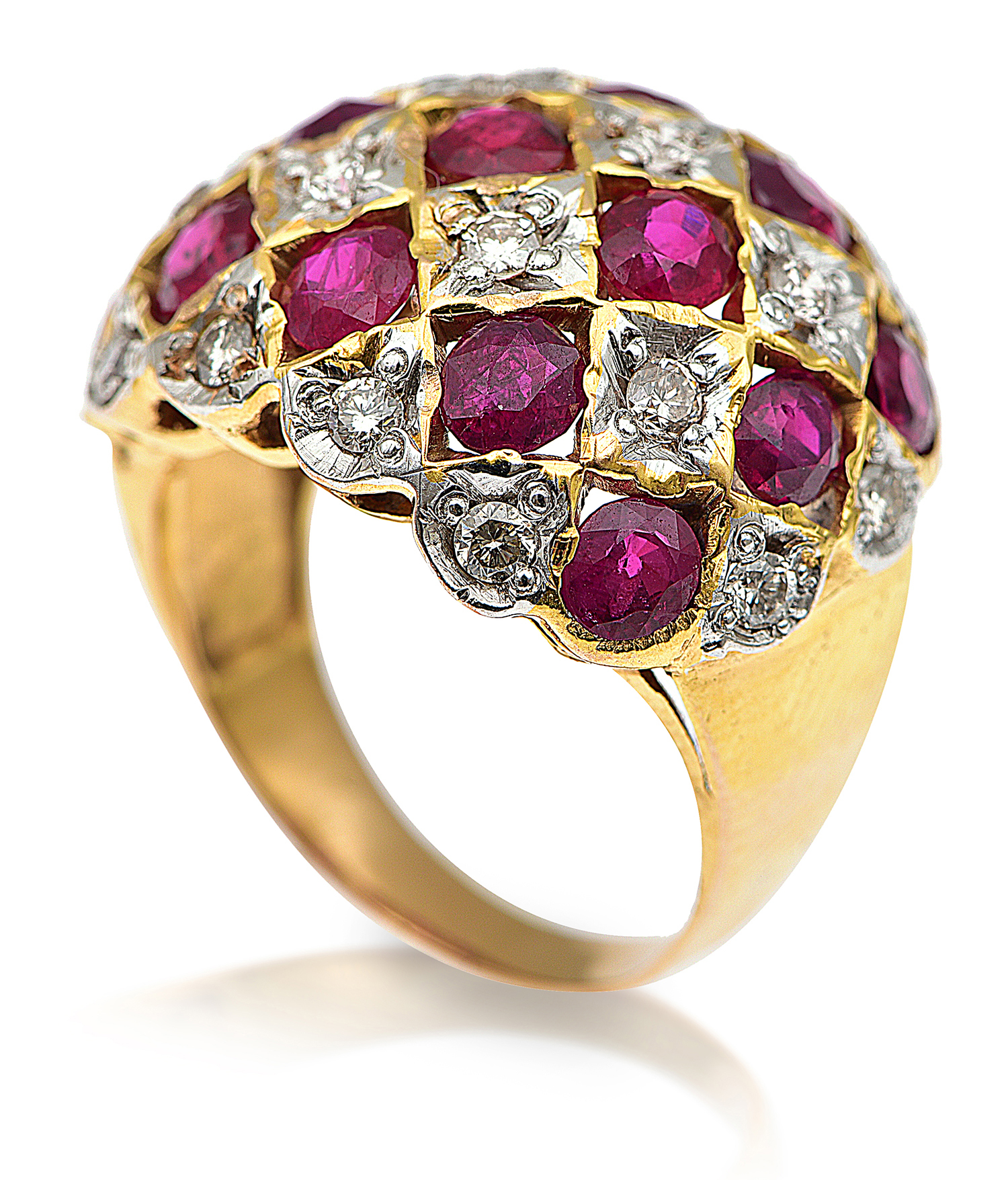 The domed panel comprising alternating rows of round and oval cut rubies and round brilliant cut diamonds set in a chequerboard pattern, mounted in 18ct gold, ring size O.