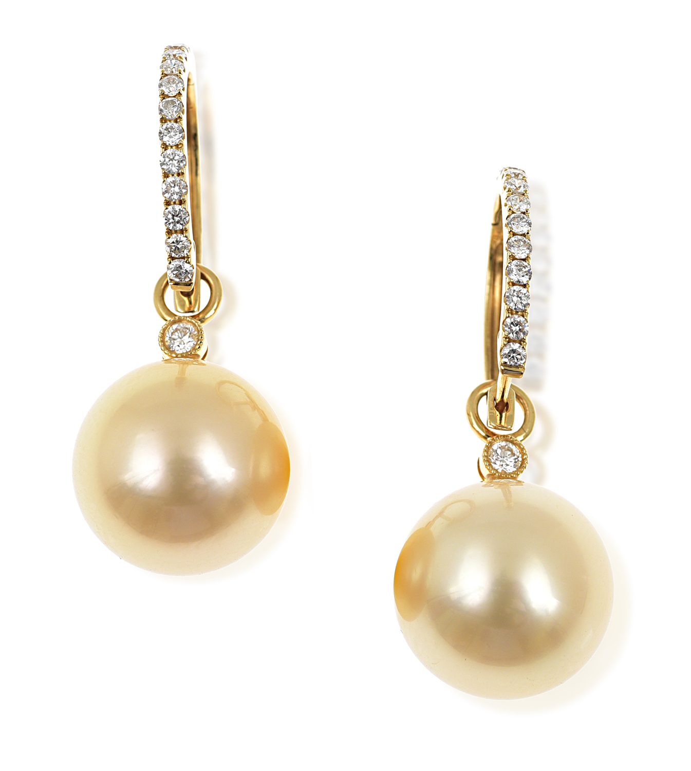 Each comprising a round pearl of yellow and gold hue measuring 13.3mm, suspended from a diamond hoop fitting, mounted in 18ct gold.