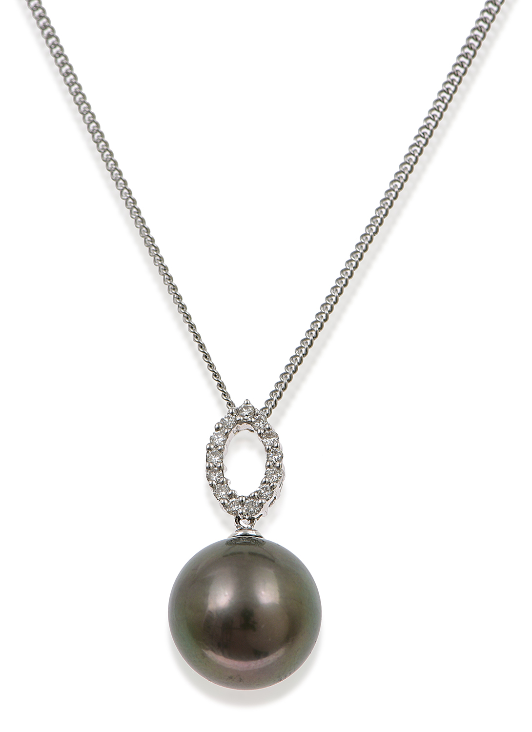 Comprising a round pearl of deep silver hue measuring 14.2mm, suspended from a diamond fitting, mounted in 18ct white gold.