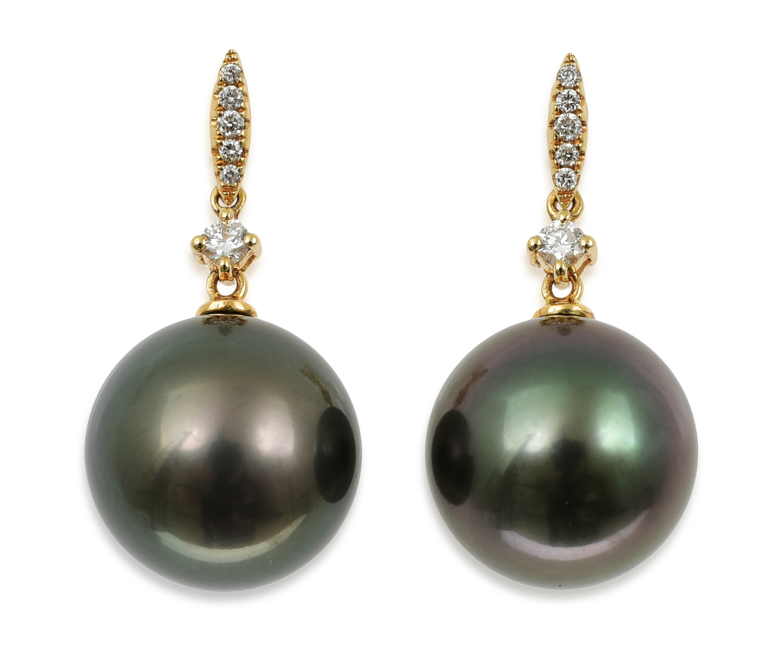 Each comprising a round pearl of peacock hue measuring 13.3mm, suspended from a diamond fitting, mounted in 18ct gold.