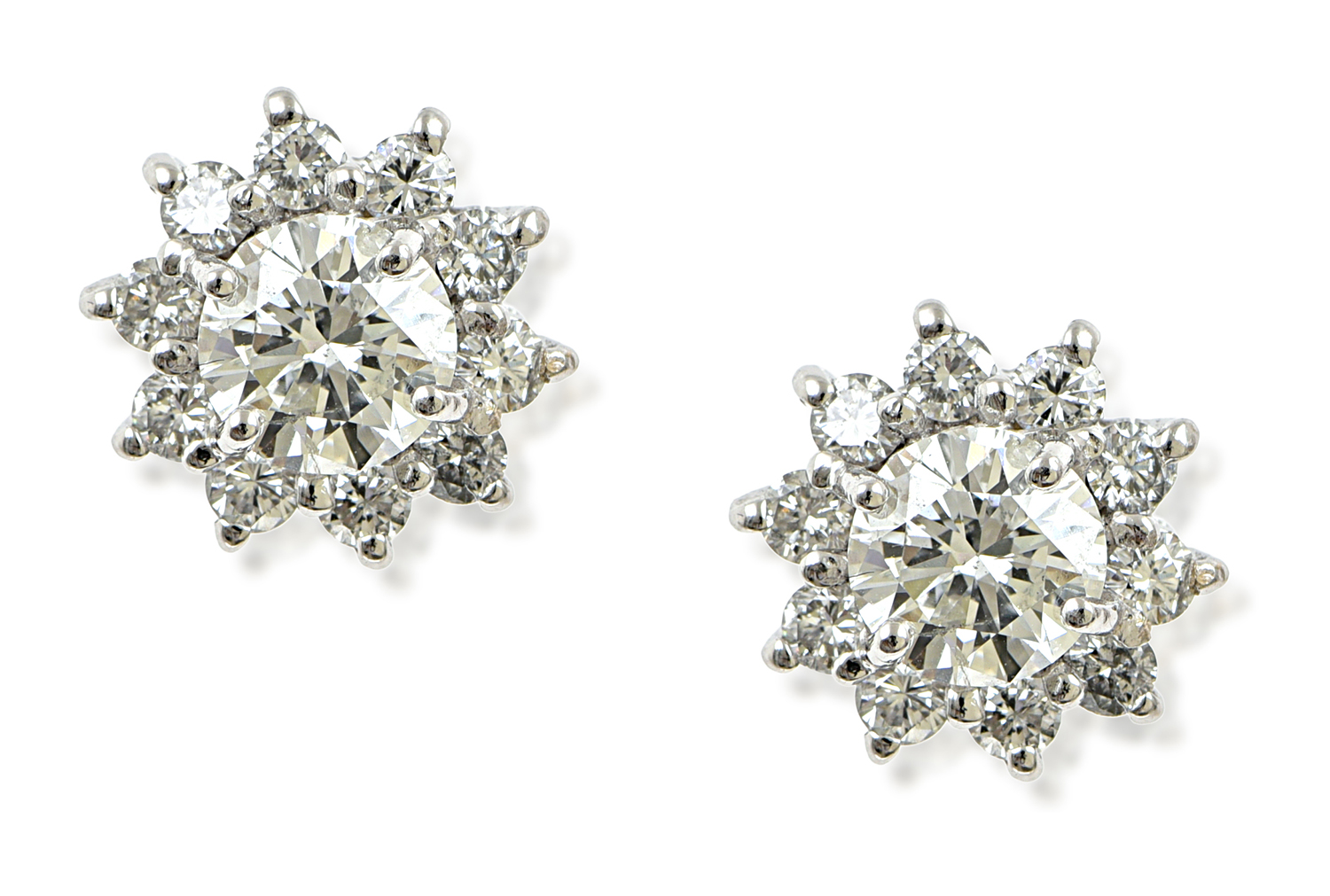 Each centrally set with a round brilliant cut diamond of 1.00cts surrounded by ten further diamonds totalling 0.50cts, mounted in 18ct white gold.