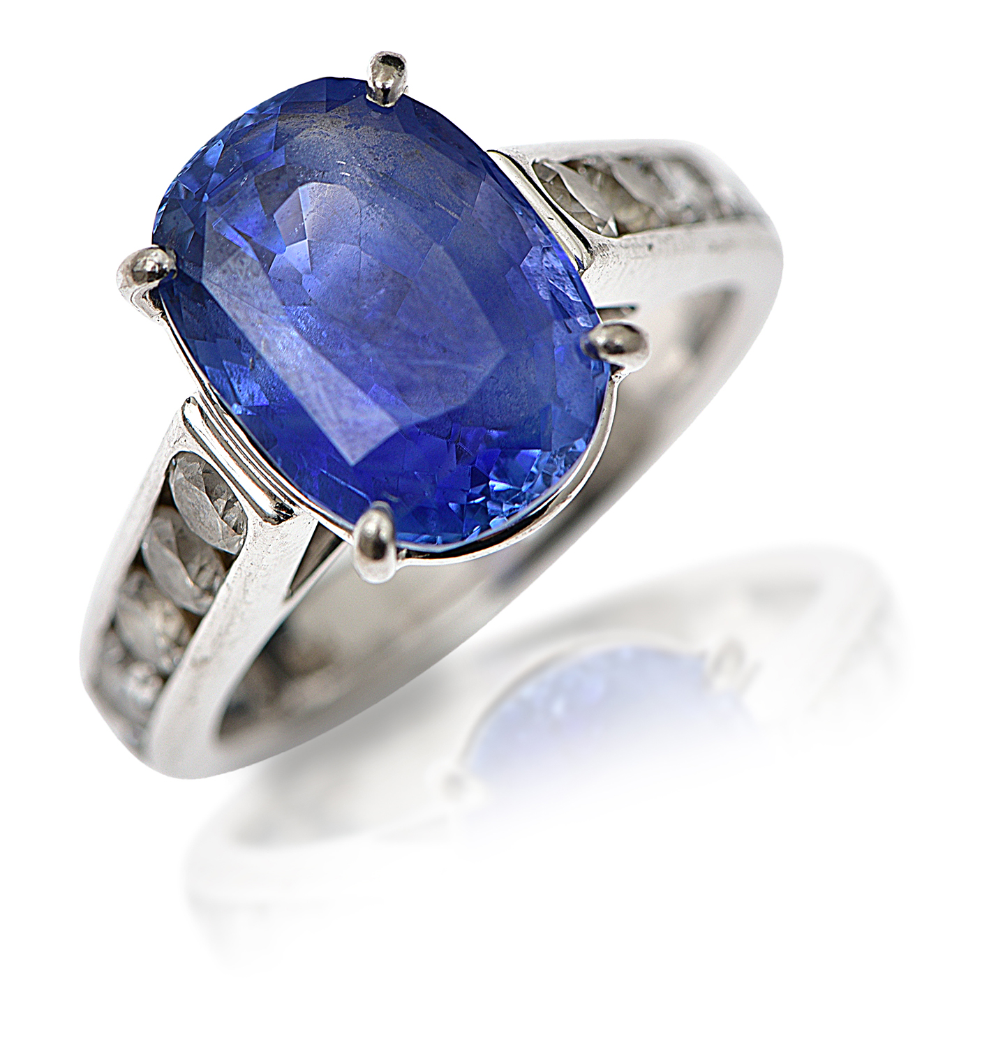 The oval cut sapphire of 7.26cts having five round brilliant cut diamonds channel set to each shoulder totalling 1.25cts, mounted in 18ct white gold, ring size N, accompanied by a GSL report stating there is no evidence of heat treatment to the sapphire.