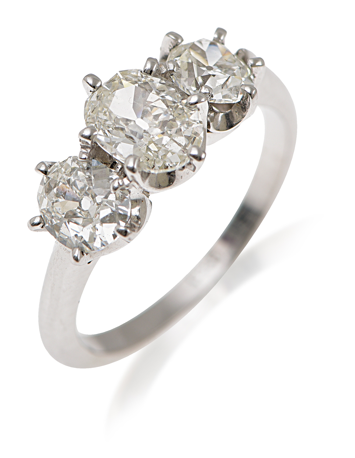 Centrally set with an old style vintage cut diamond of 0.91cts, flanked by two further diamonds totalling 1.14cts, mounted in 18ct white gold, ring size O.