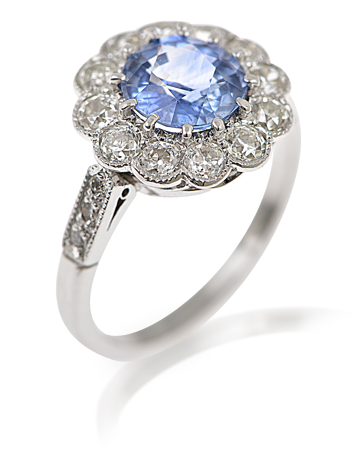 Centrally set with a round Ceylon sapphire of 2.00cts, having old style vintage cut diamonds set to the surround and shoulders, mounted in 18ct white gold, ring size M.