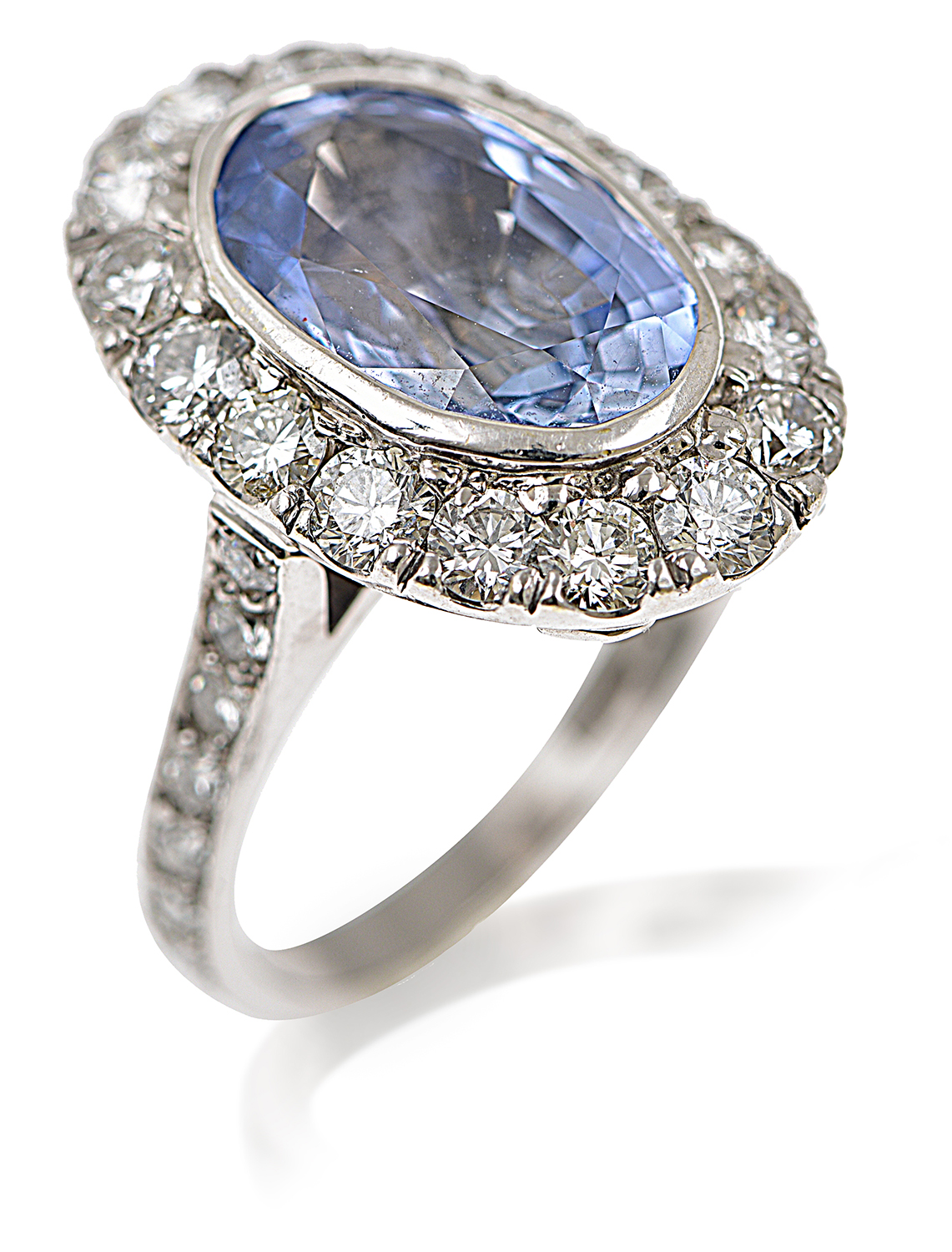 The oval cut sapphire of 4.82cts surrounded by sixteen round brilliant cut diamonds totalling 1.34cts with further diamonds set to the shoulders, mounted in 18ct white gold, ring size I.