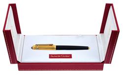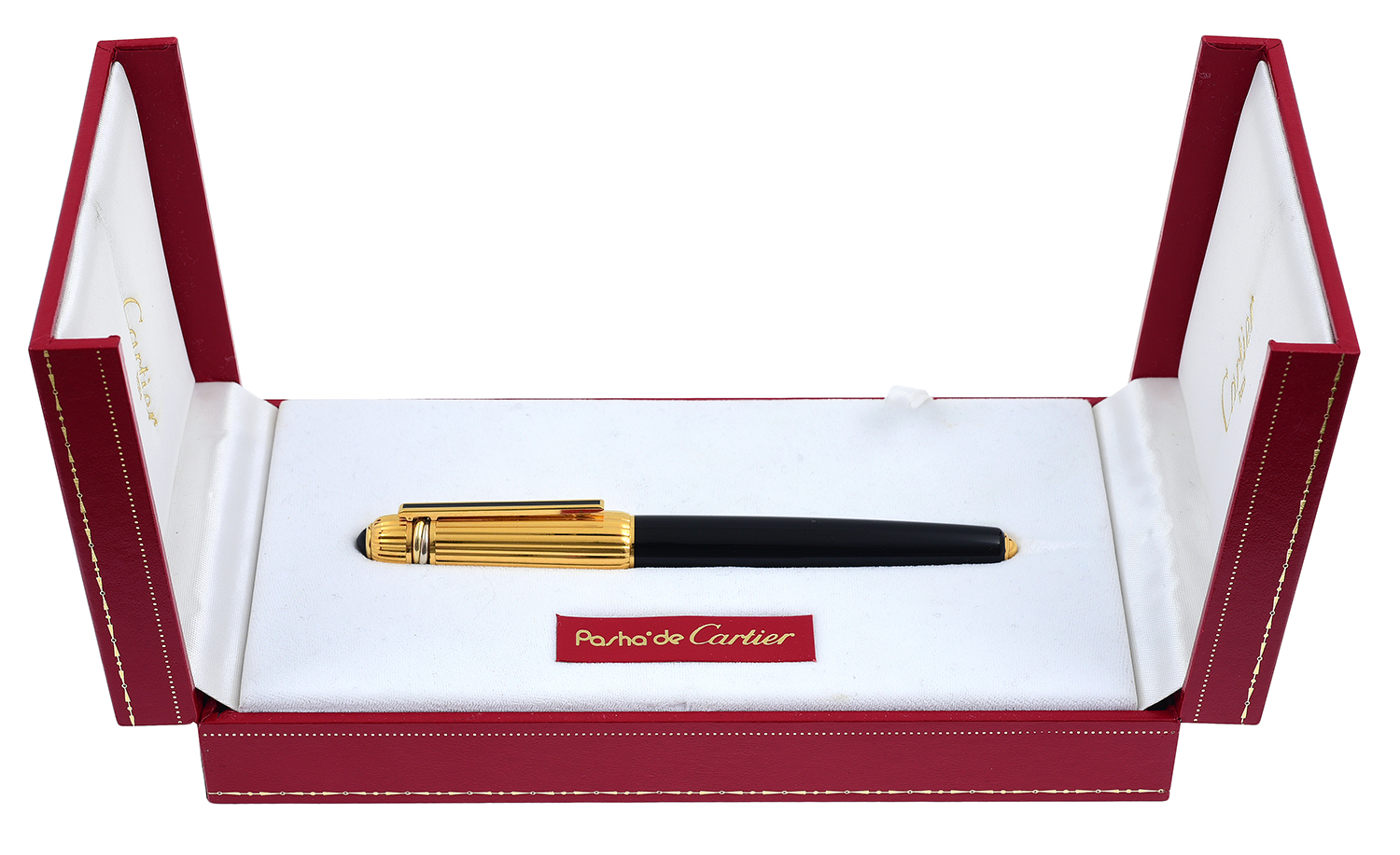 From the Pasha de Cartier range, the fountain pen styled in gilt metal and black celluloid, with 18ct gold nib, with box and papers.