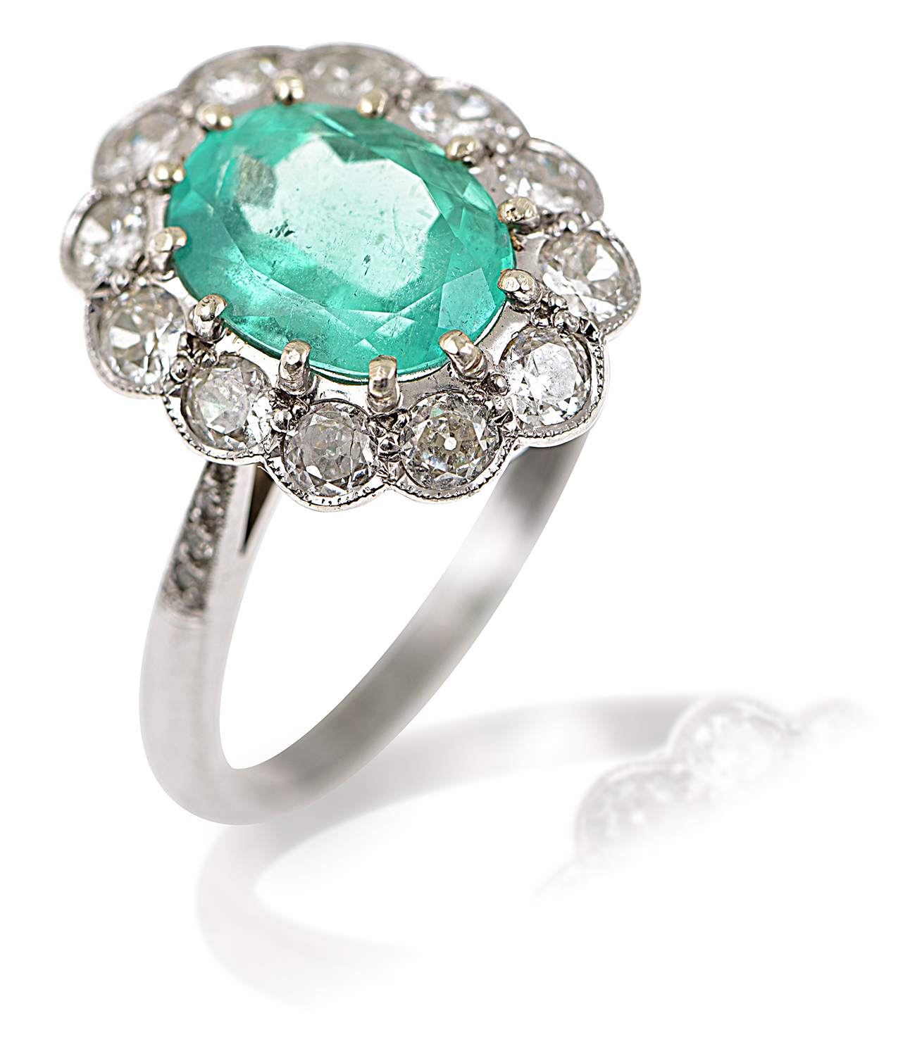 The oval cut emerald of 2.50cts having twelve old style vintage cut diamonds set to the surround totalling 0.89cts, mounted in 18ct white gold, ring size O-P.