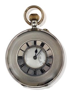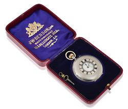 Key wind and set, circular white enamel dial with Roman numerals, subsidiary seconds dial at six, engine turned sterling silver case, hallmarked, with original box.