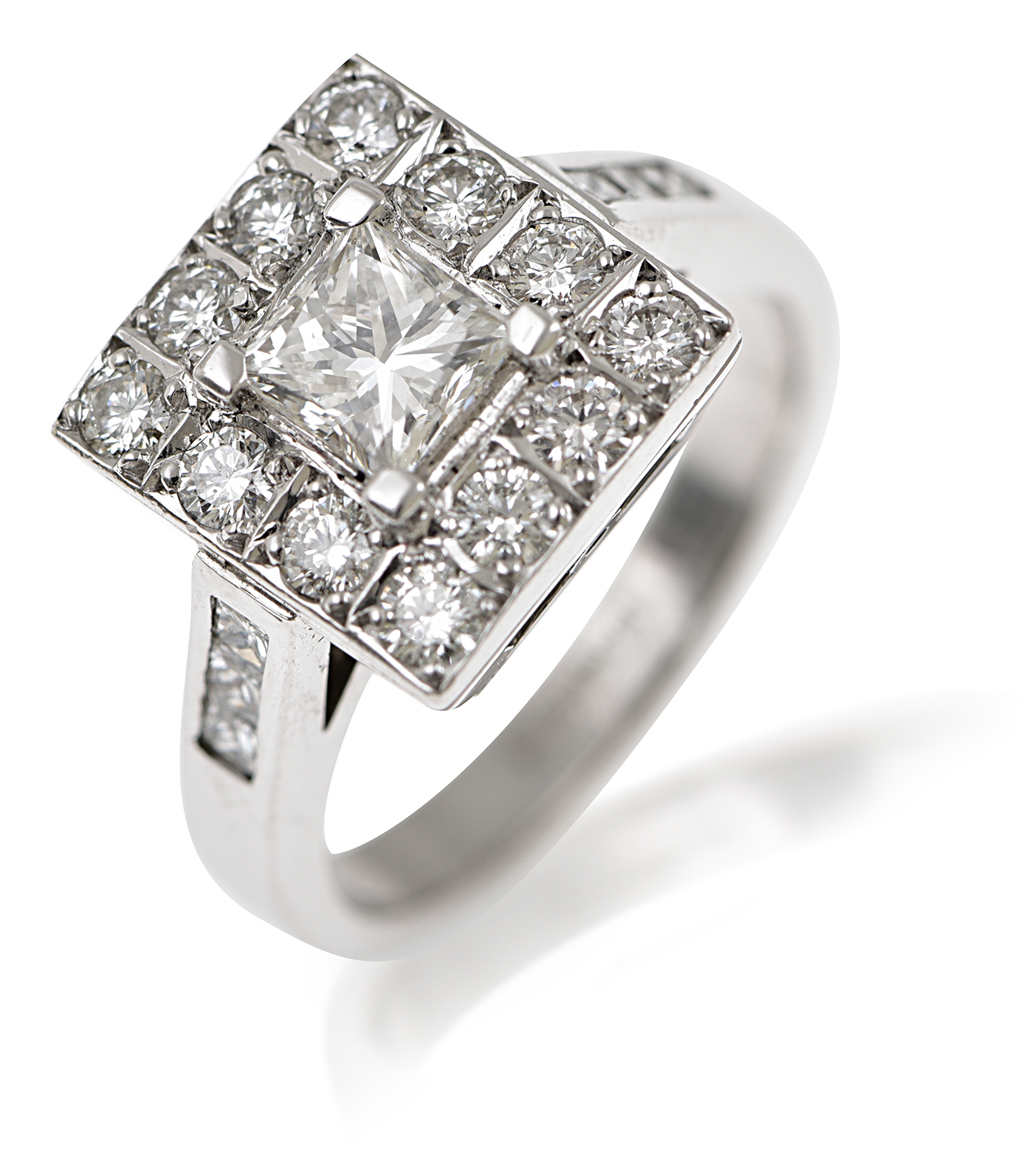 Ring presents in as new condition and stones are secure in their settings. Princess cut diamond is colour G, clarity VS, surrounding stones are colour G, clarity VS-SI.