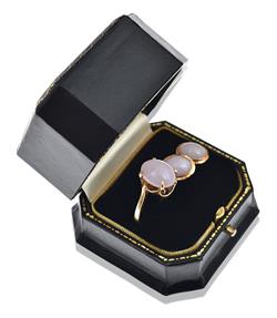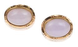 Comprising a ring and pair of earrings, each set with an oval lavender jade cut en cabochon, mounted in 14ct gold, ring size P.