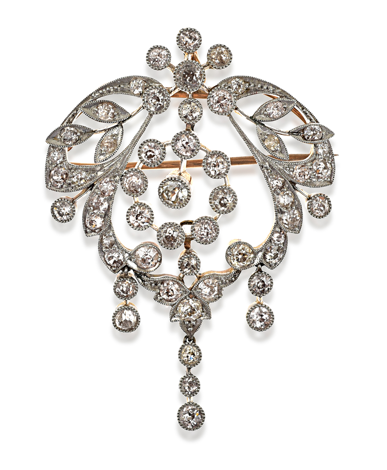 The pierced foliate frame grain set throughout with old cut diamonds totalling 3.94cts, mounted in platinum and 15ct gold.