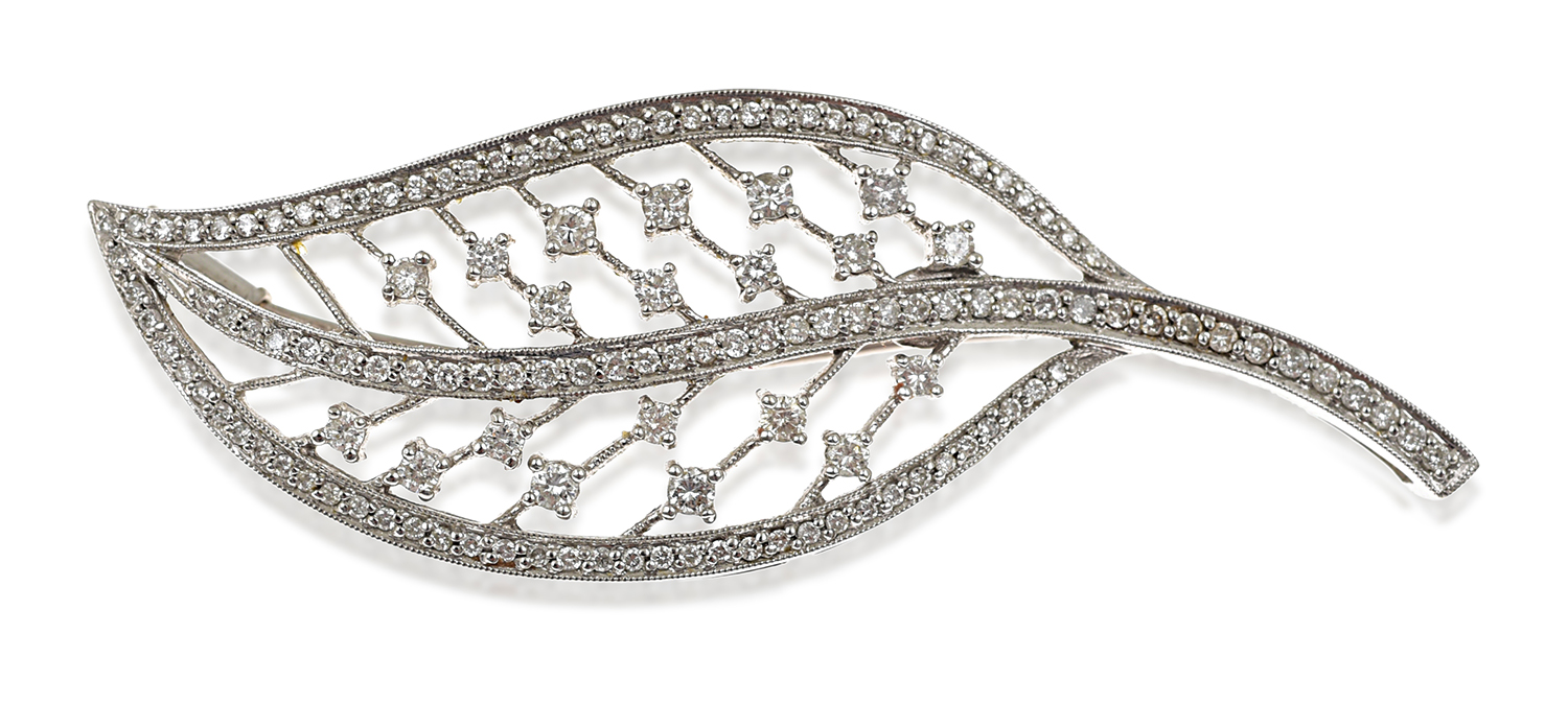 Of pierced foliate design set throughout with round brilliant cut diamonds totalling 1.56cts, mounted in 14ct white gold.