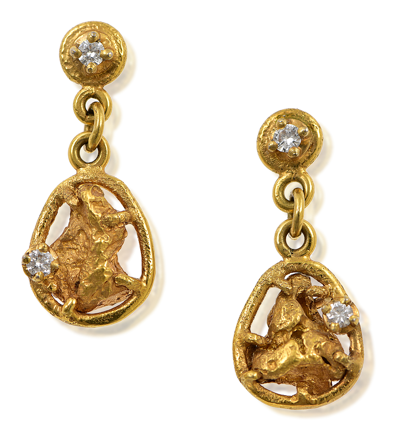 Each featuring a nugget offset with a round brilliant cut diamond, surmounted by a panel of conforming design, mounted in 18ct gold.