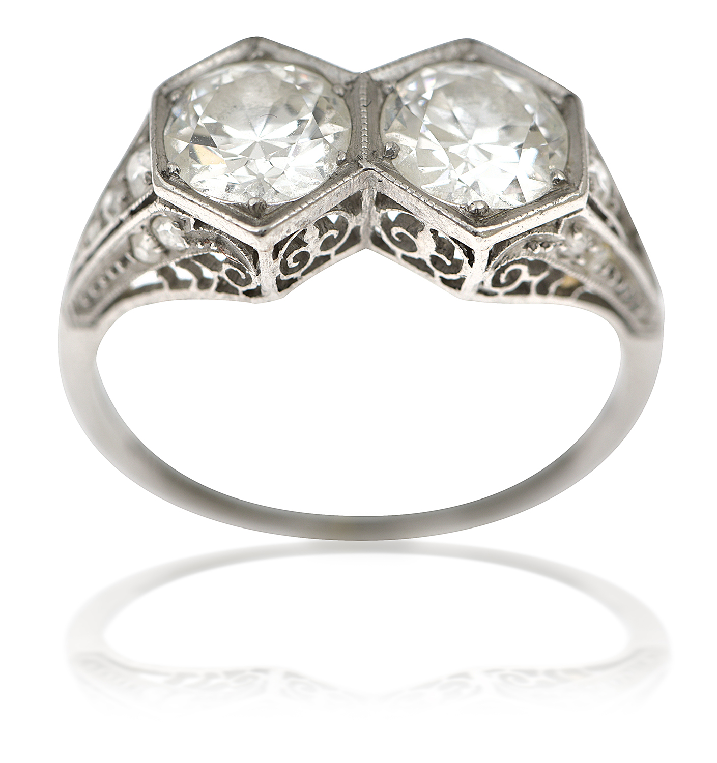 Featuring two transitional brilliant cut diamonds in millegrain hexagonal mounts totalling 1.80cts, with scroll pierced under bezel with further diamond detail, mounted in platinum, ring size M-N.