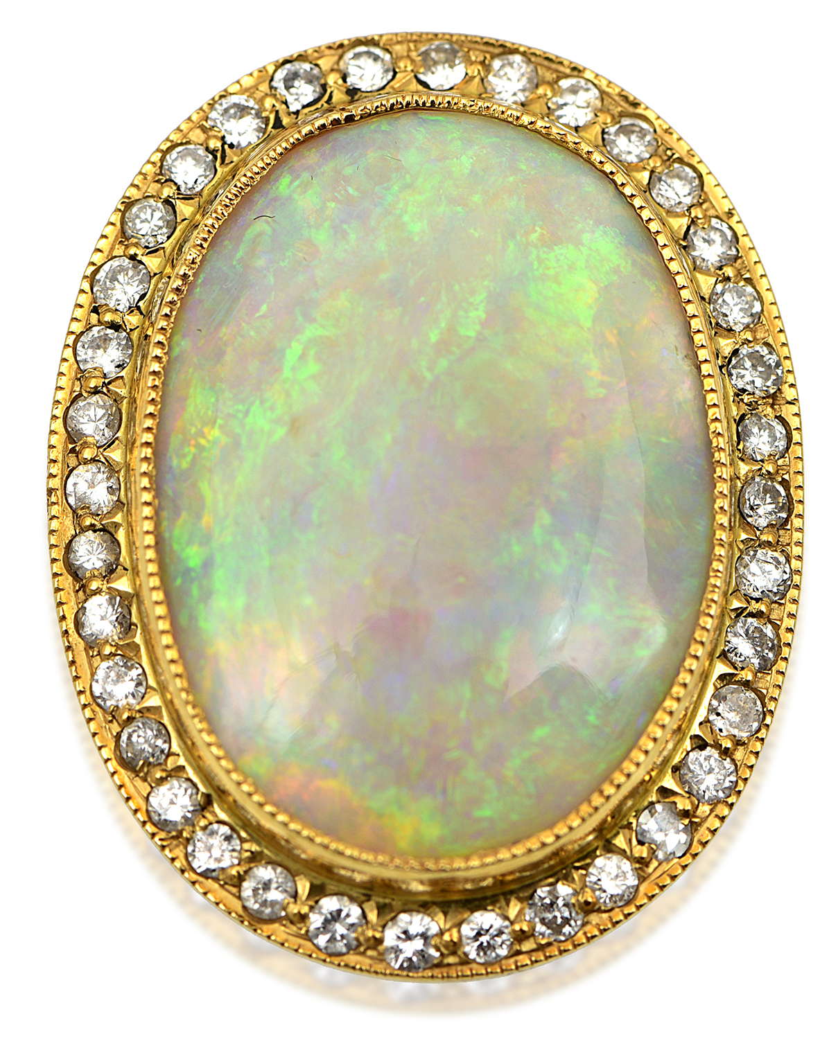 Ring presents in very good condition. Opal measures 22.46mm x 16.61mm x 4.82mm estimated total weight 9.81cts. Hallmark London, Sponsor 'KC' Scribing '1/10 90'. Diamonds assessed mounted as colour H/I, clarity VS. Gross weight: 12.8gms