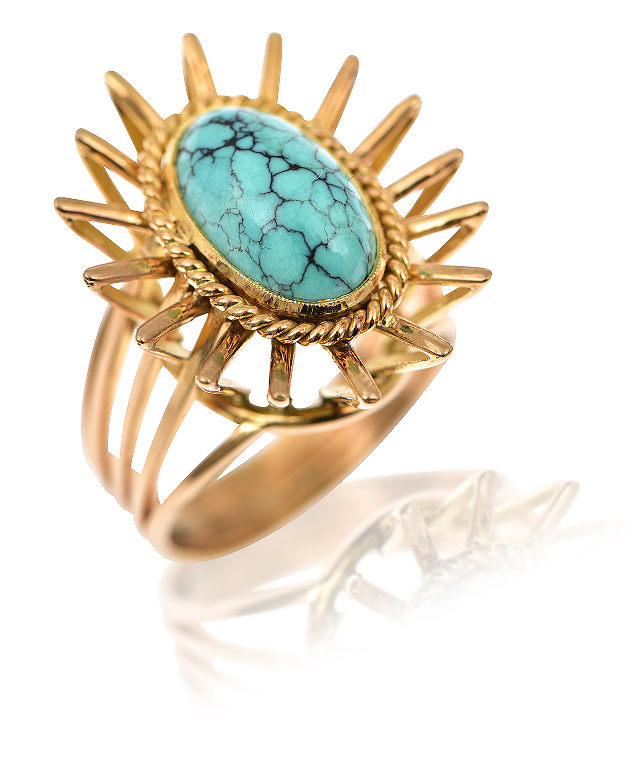 Centrally set with an oval turquoise cut en cabochon to a pierced radiating frame and split band, mounted in 18ct gold, ring size L.