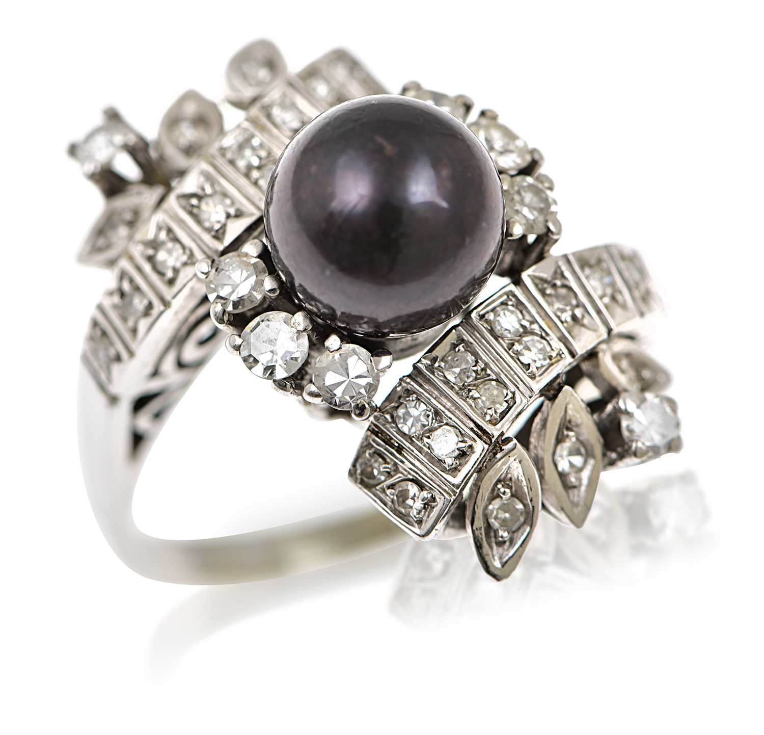 Centrally set with a black pearl measuring 8mm, to an abstract diamond setting totalling 0.70cts, mounted in white gold, ring size M.