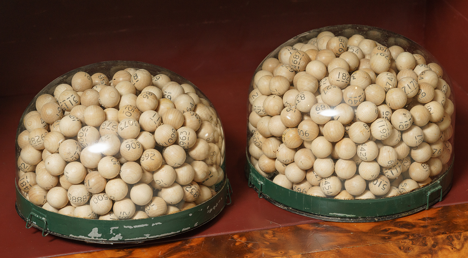 A PAIR OF MID CENTURY FRENCH DOMES WITH VINTAGE BINGO BALLS