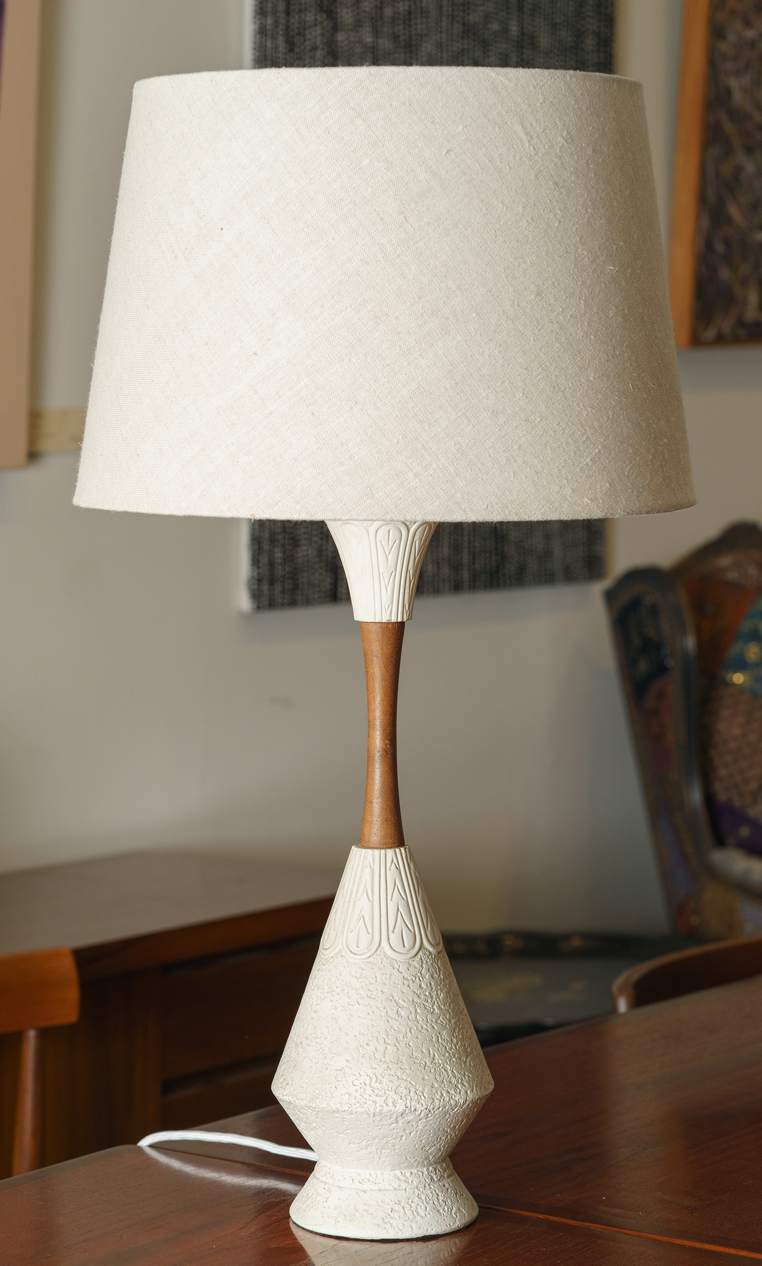 Teak centre, fully rewired with linen shade