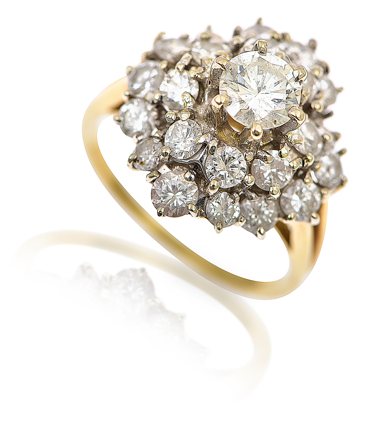 In very good condition. central diamond approximately 5.52mm, bordered by twenty two 2.70mm to 2.90mm brilliant cut diamonds. Hallmark London import. Sponsor 'D&T'. Estimated total diamond weight: 2.36cts. Approximate colour H/I and clarity VS/SI2. Gross weight: 5.8gms