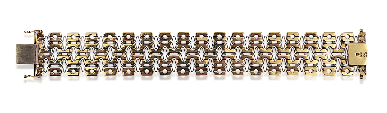 Composed of bark pattern pierced links interspersed by open lozenge sections, mounted in yellow and white gold, London import hallmark, total length 180mm.