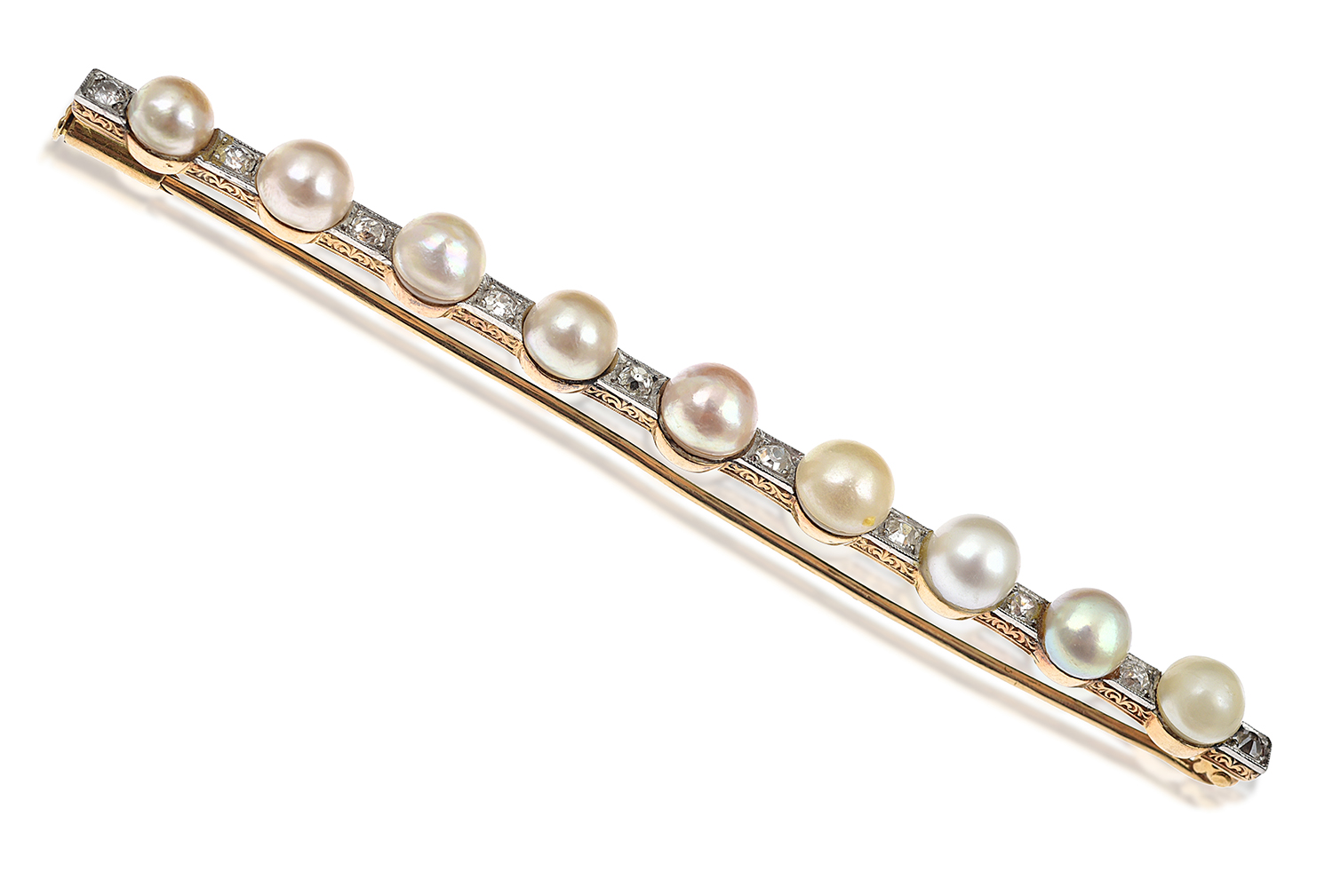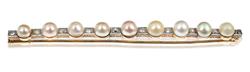 The bar brooch set with nine half pearls of cream and pink hues interspaced by ten old European cut diamonds totalling 0.80cts, mounted in 18ct gold.