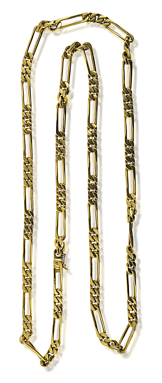 Total weight 71.7gms. 9ct gold. Having a figure eight safety catch. Signed on the clasp JTG.