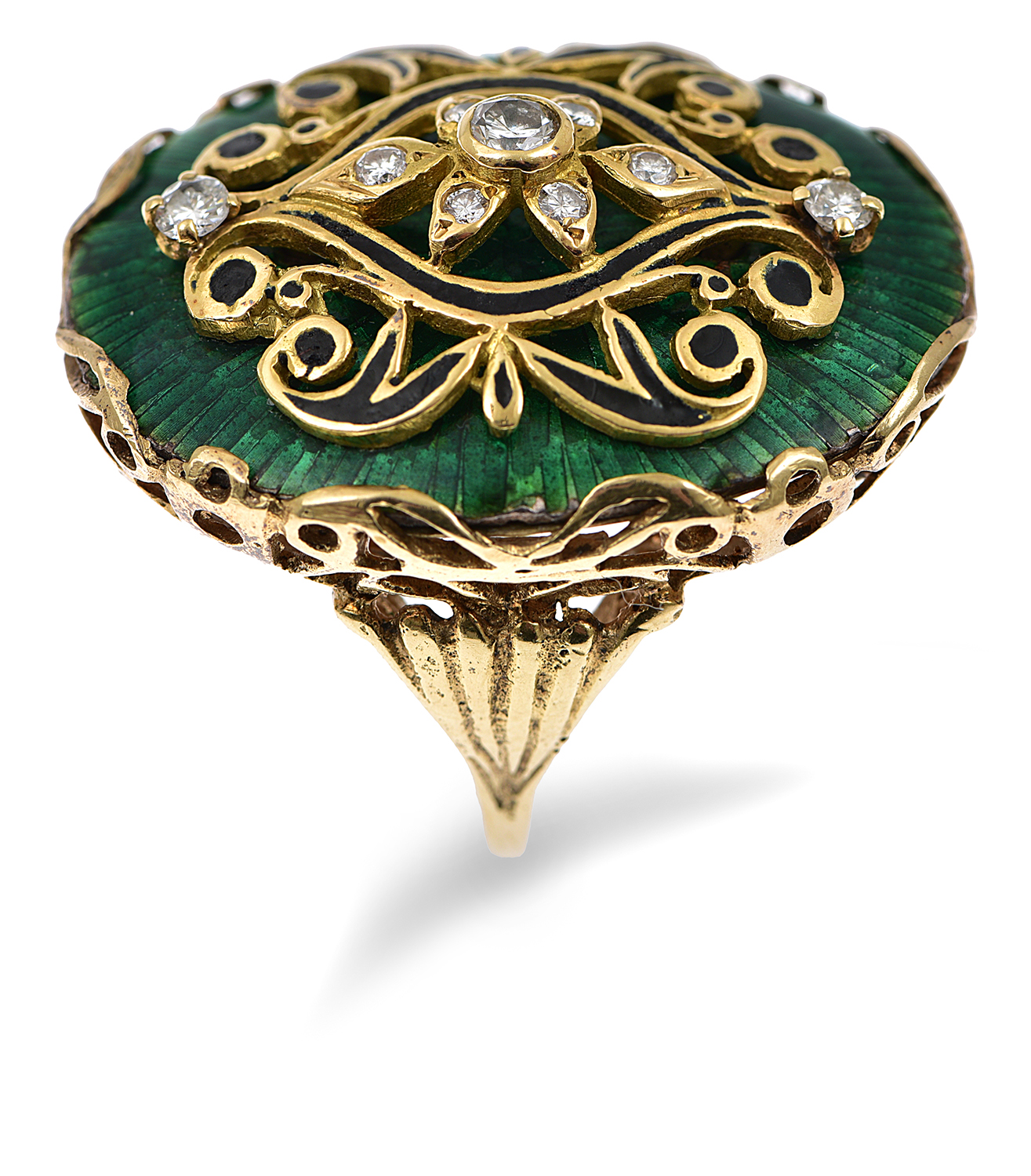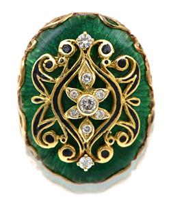 The green guilloche enamel plaque overlaid with gold scroll decoration, highlighted by round brilliant cut diamonds and black enamel, mounted in 14ct gold, ring size L.