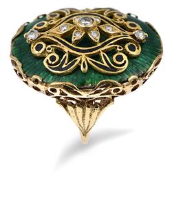 Ring presents in good condition. Some nibbles to the edge of the green enamel, black enamel appears a little rough. Diamonds are colour G, clarity VS-SI.. Some wear to the shank.