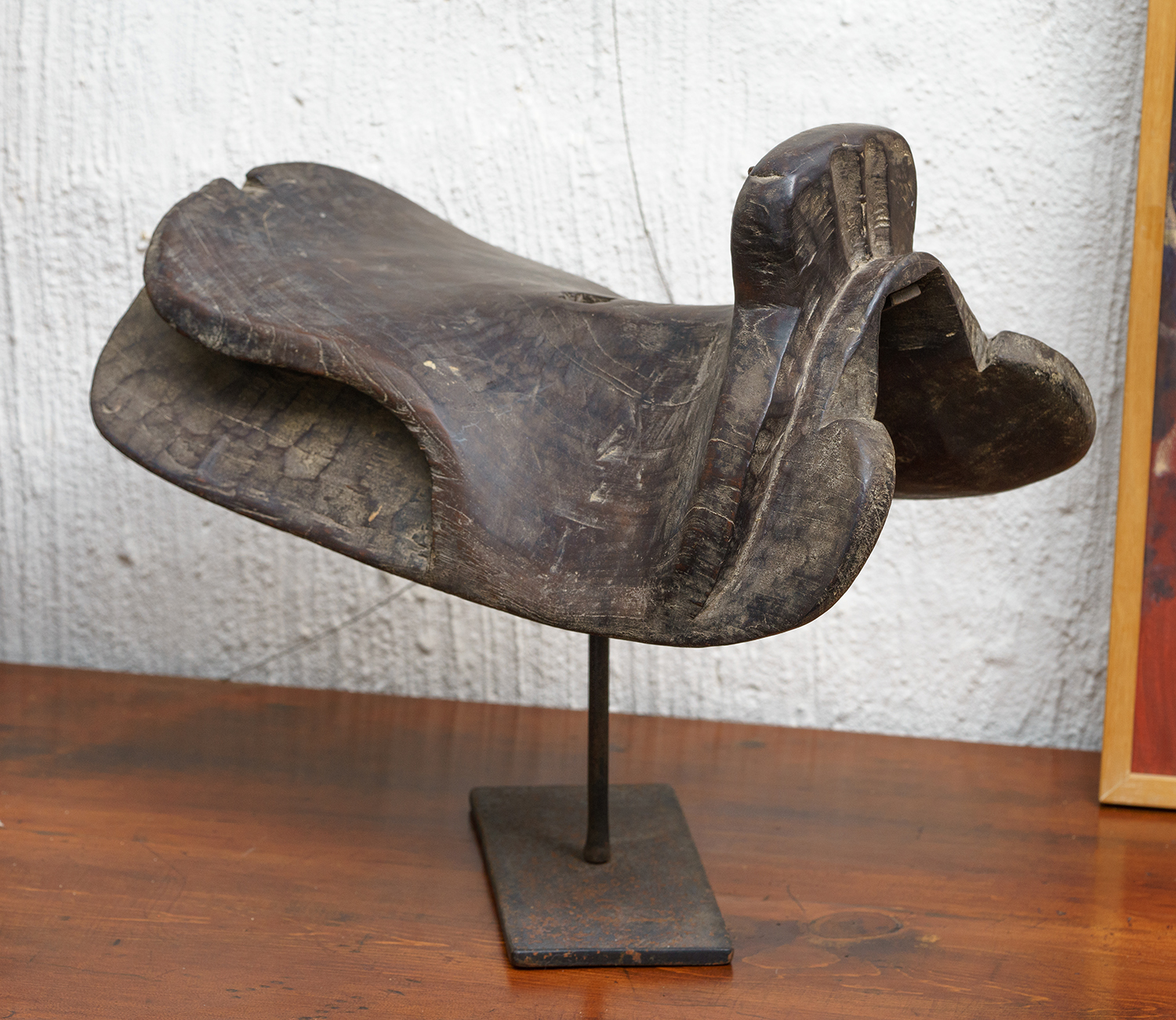 AN ANTIQUE INDIAN HAND CARVED SADLE ON STAND