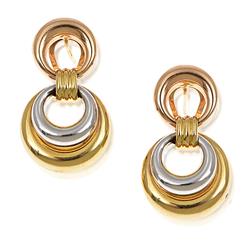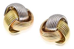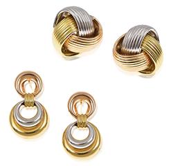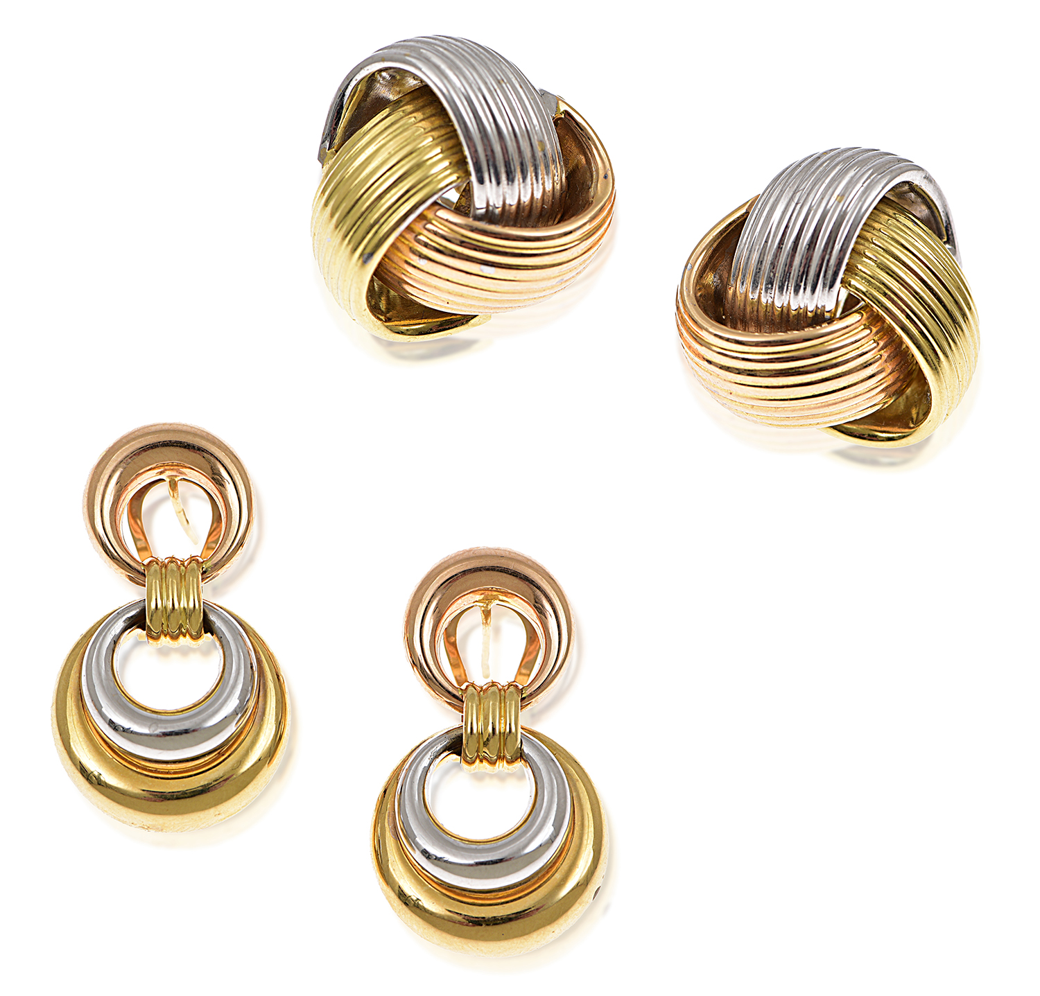 One pair modelled as knots, the other pair as pierced hoops, both modelled in 18ct tri-coloured gold.