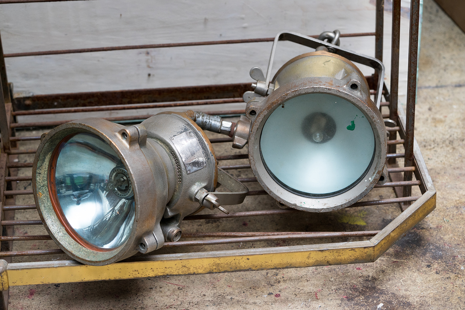 A PAIR OF INDUSTRIAL CAST IRON HANGING LIGHTS