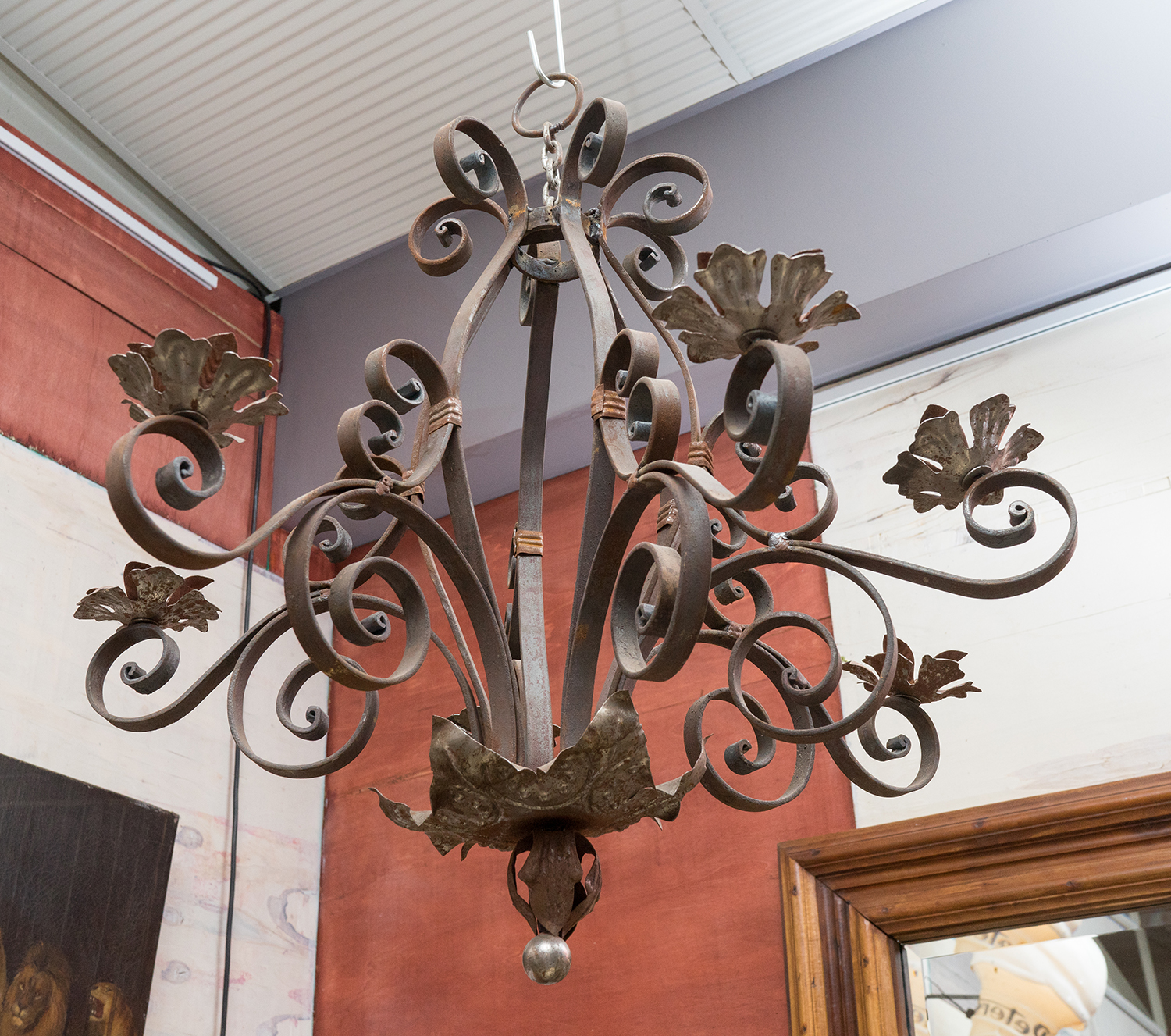 A DECORATIVE WROUGHT IRON SIX BRANCH CANDELABRA