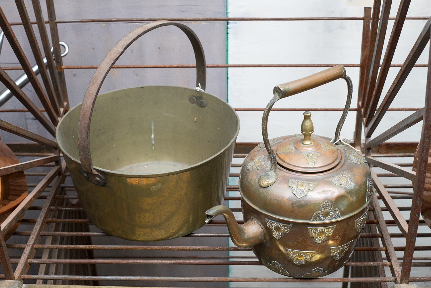 A 19th CENTURY COPPER KETTLE AND SOLID BRASS JAM PAN