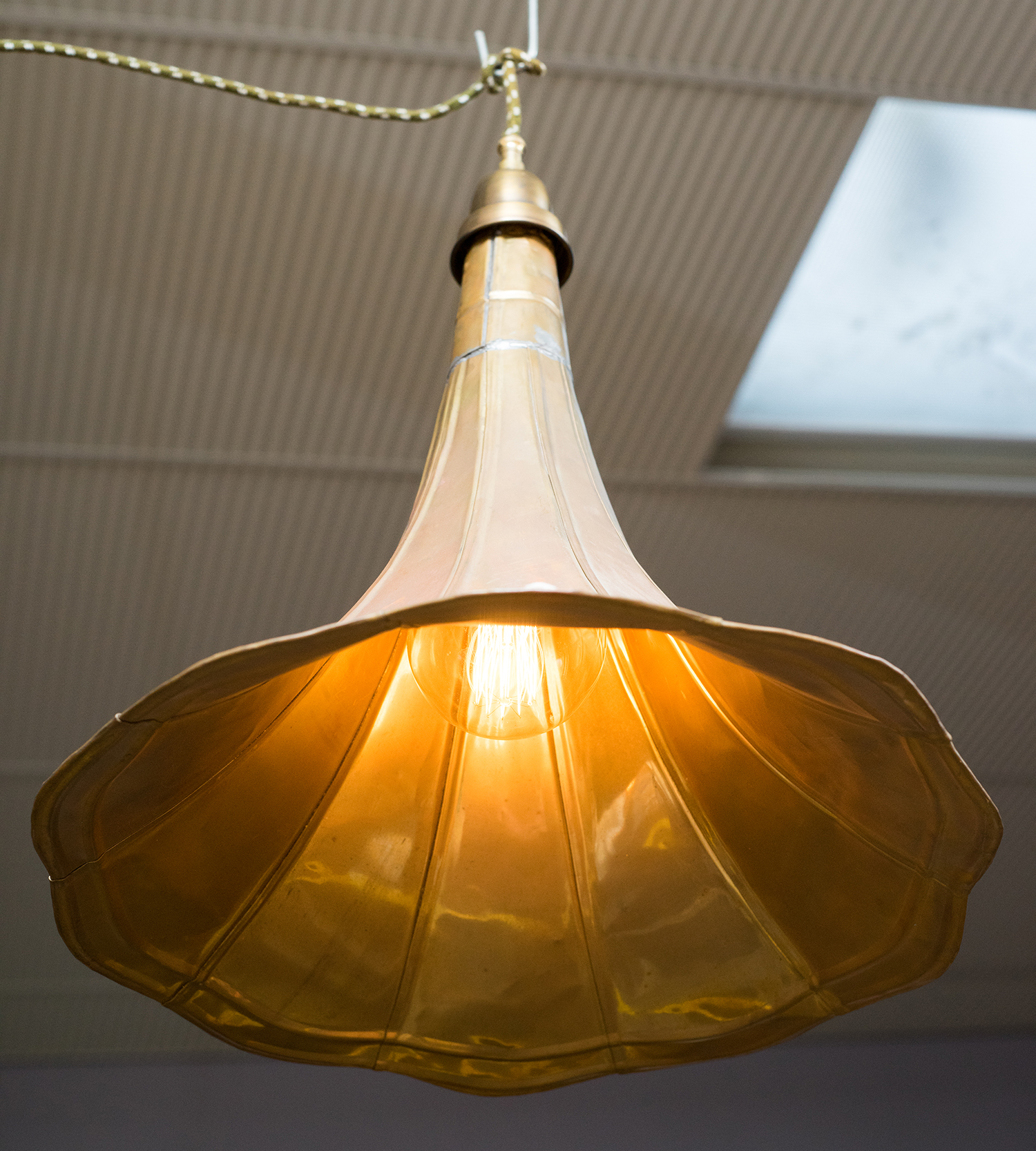 A 1930s GRAMAPHONE HORN CONVERTED TO CEILING LIGHT