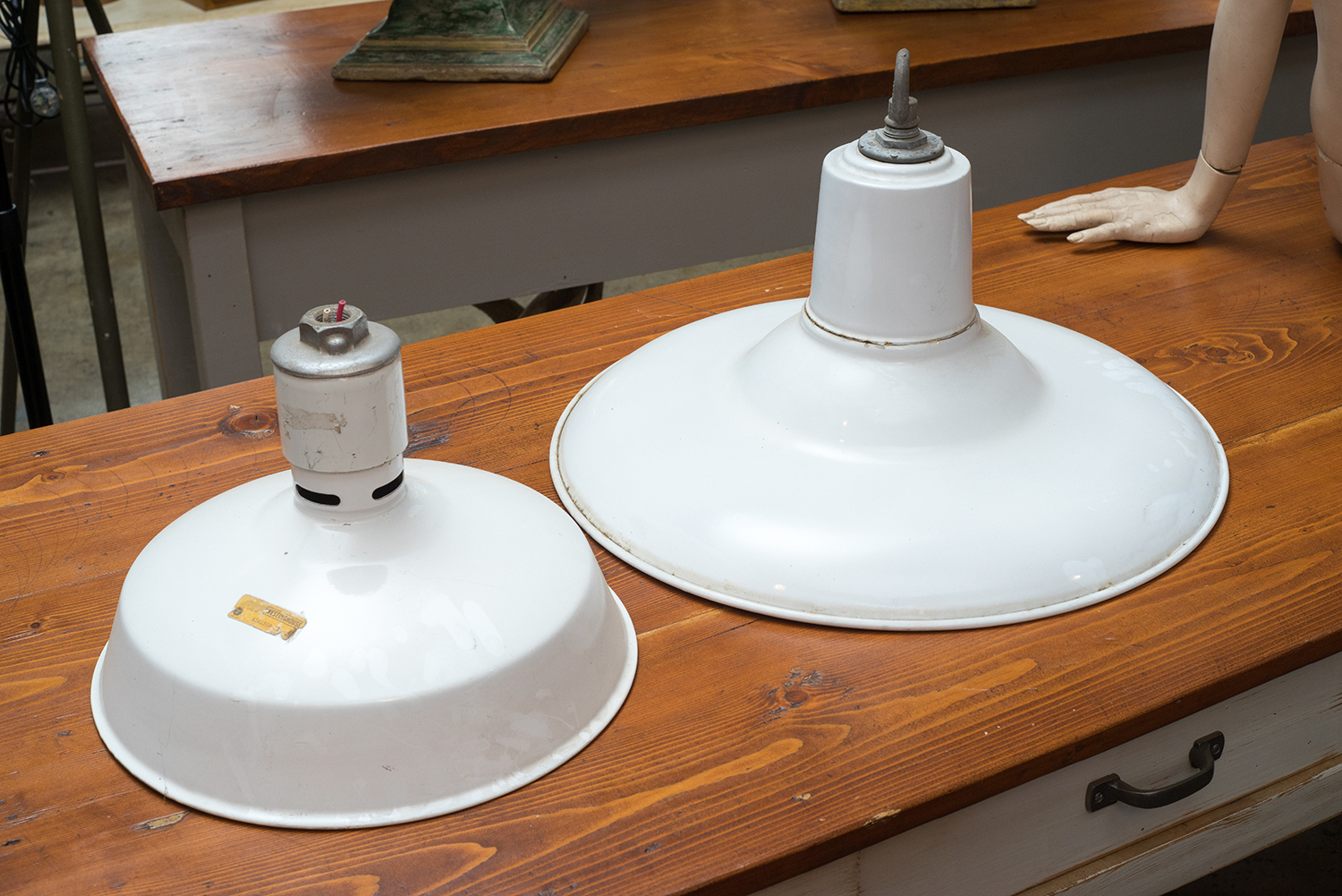 TWO EARLY 20th CENTURY INDUSTRIAL ENAMELLED CEILING LIGHTS