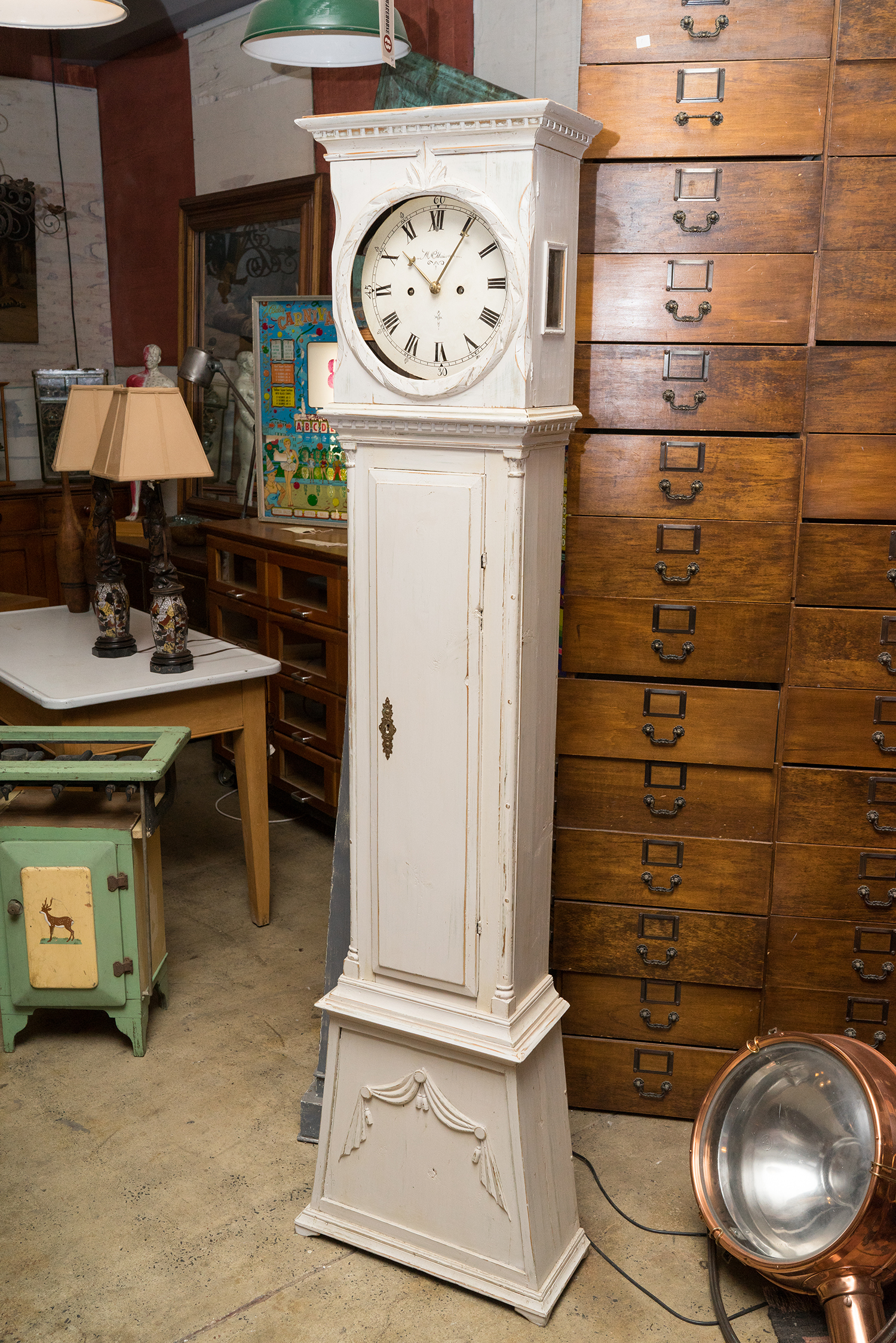 No glass on face, restored mechanism. Distressed finish to paintwork on body. A wood knot segment missing from left side.